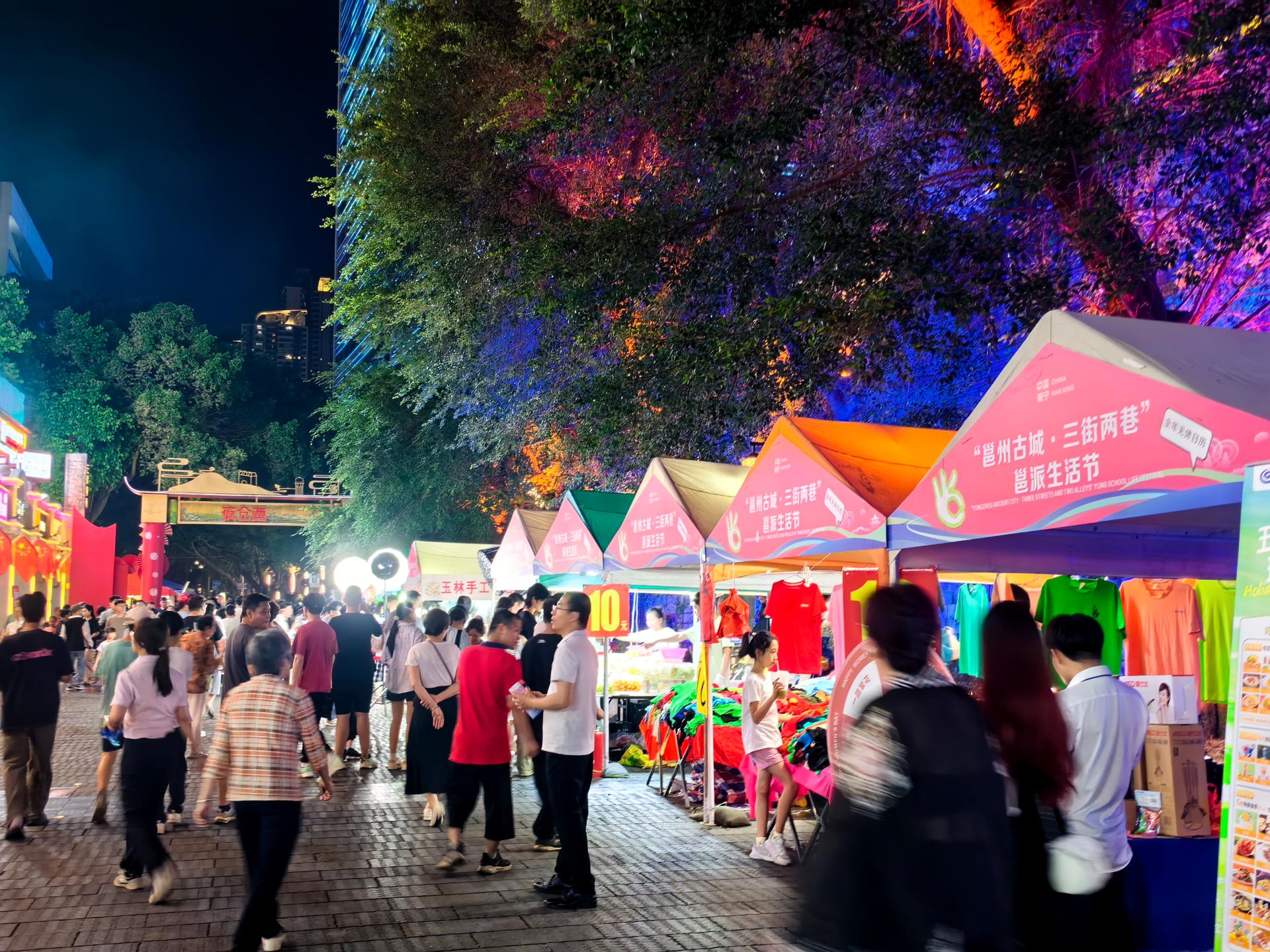 “五一”期間,邕州古城·三街兩巷歷史文化街區(qū)邕派生活節(jié)活動(dòng)現(xiàn)場熱鬧非凡,活動(dòng)中的文創(chuàng)IP市集以一場“治愈大會”為主題成功吸引了眾多市民和游客前來參與,其中,三個(gè)活動(dòng)主場地均設(shè)置了如“45°青年”“去打工吧!”等合影打卡墻,并結(jié)合一場場治愈音樂會讓每一位游客都能感受到南寧獨(dú)特的夜生活多巴胺!據(jù)統(tǒng)計(jì),“五一”假期期間三街兩巷接待游客量達(dá)43.5萬人次,同比上年同期增長9%,各商戶合計(jì)營業(yè)額同比上年同期增長約13%。其中,5月1日單日接待游客近10萬人次。