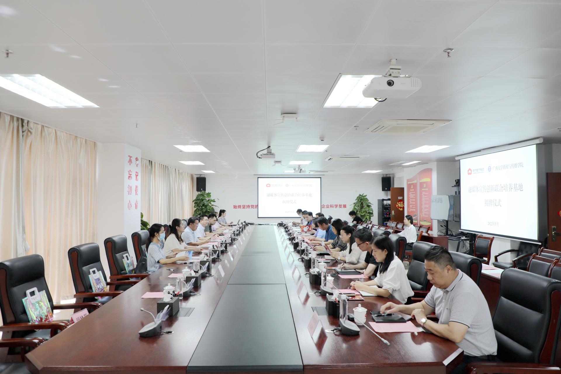 5月30日,南寧威寧集團、廣西大學新聞與傳播學院共建融媒體宣傳創(chuàng)新聯(lián)合培養(yǎng)基地揭牌儀式暨座談會在威寧大廈22樓第一會議室舉行,廣西大學新聞與傳播學院黨委書記唐興一行8人,集團黨委副書記馬超毅,集團公司黨委宣傳部、人力資源部負責人,各監(jiān)管單位宣傳工作分管領導參加活動。