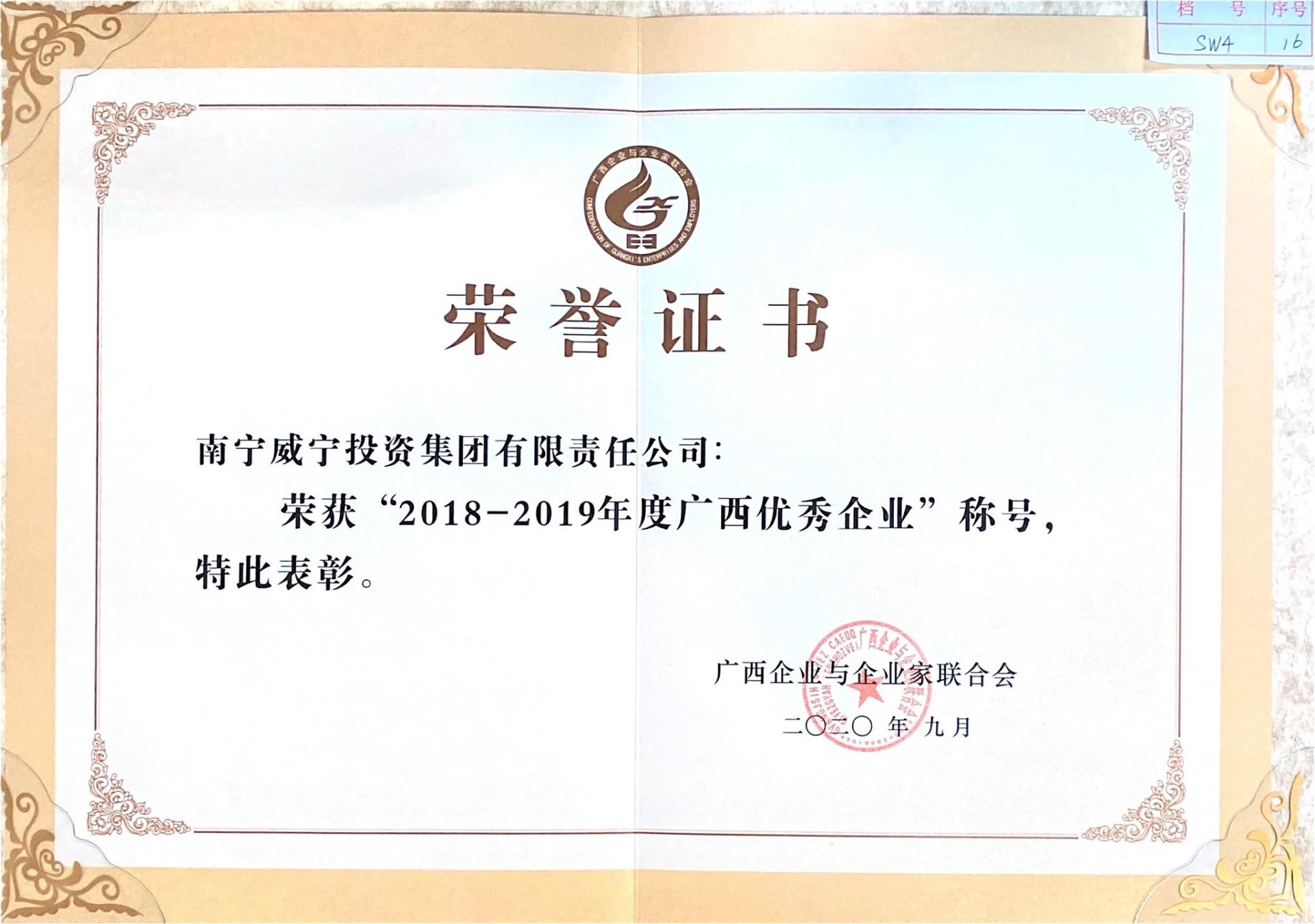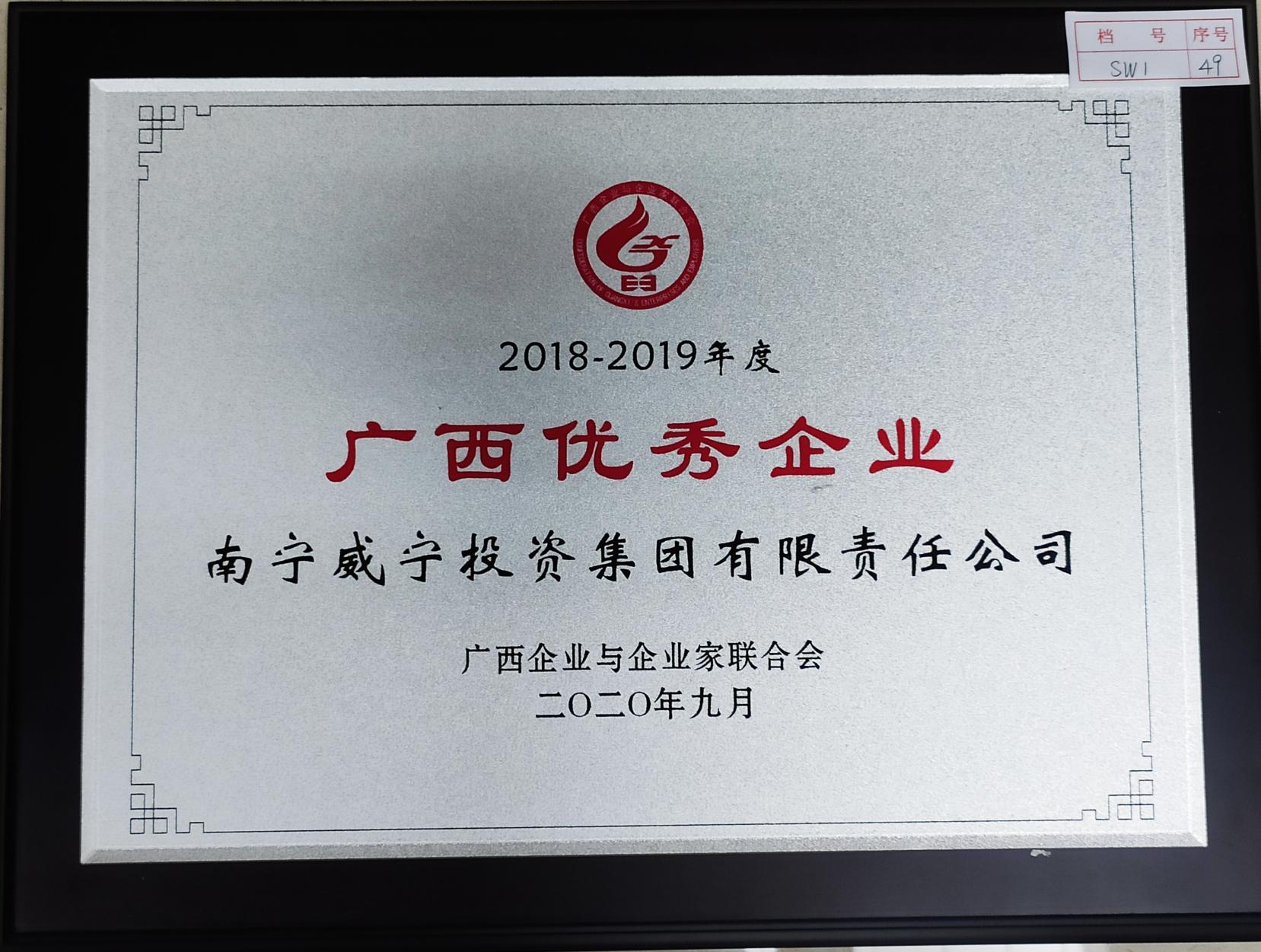 2020年9月,南寧威寧集團(tuán)榮獲南寧市廣西企業(yè)與企業(yè)家聯(lián)合會(huì)授予的“2018-2019年度優(yōu)秀企業(yè)”榮譽(yù)證書