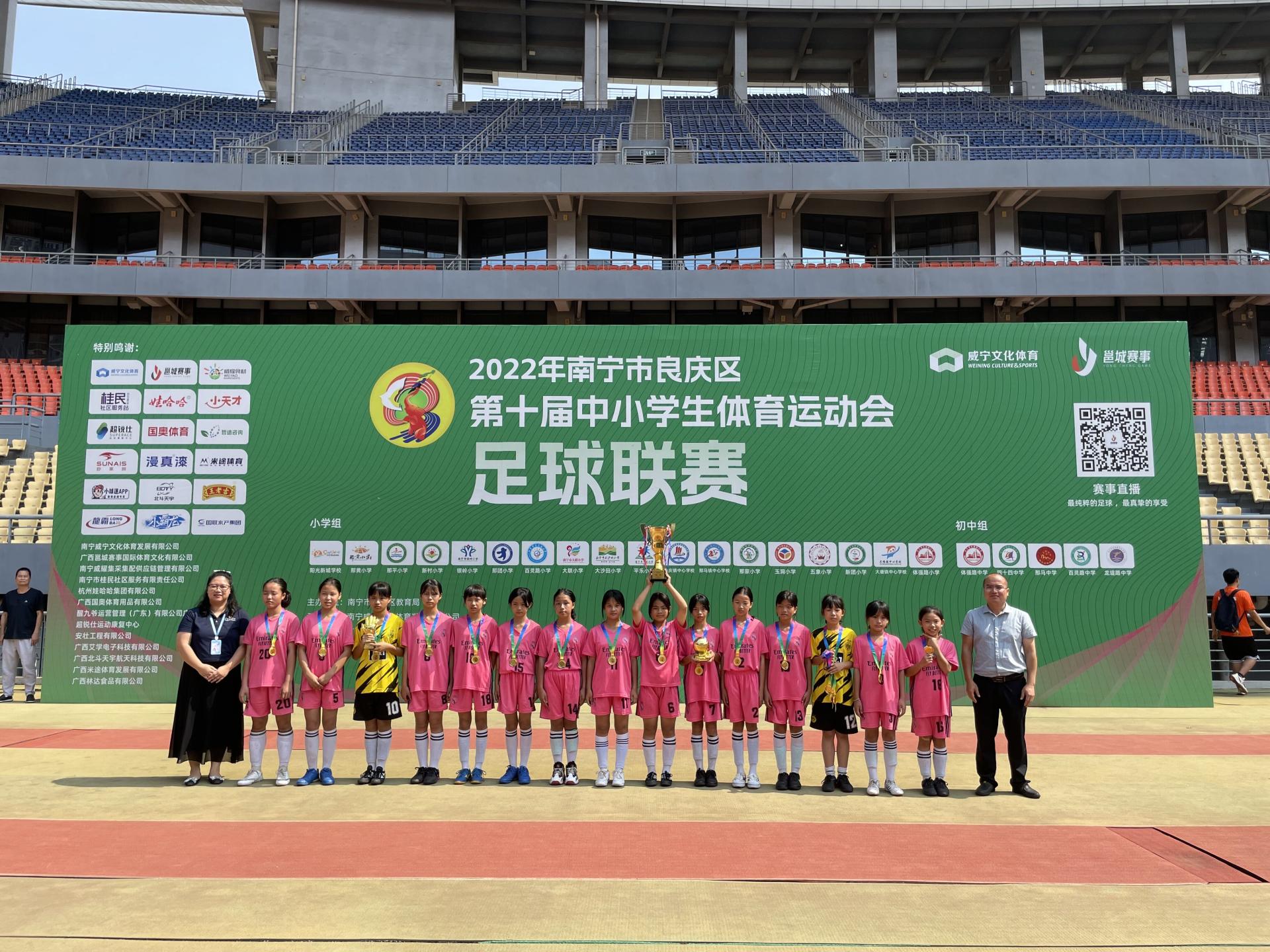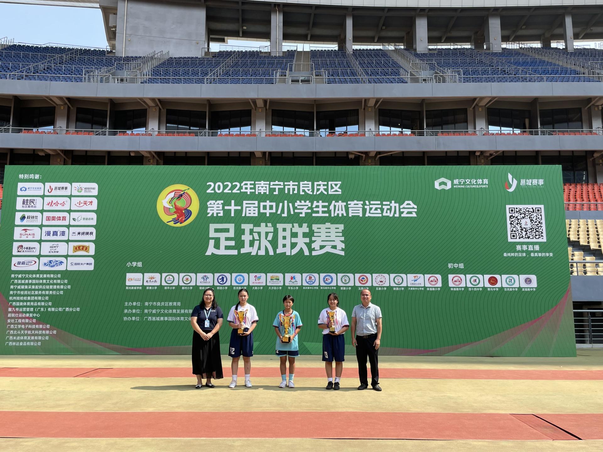 本次足球賽采取七人制足球規(guī)則,共有良慶區(qū)29所中小學(xué)校39支隊(duì)伍參賽。陽(yáng)光新城學(xué)校,南寧四十四中分獲男子小學(xué)組、初中組冠軍,那團(tuán)小學(xué)、體強(qiáng)路初級(jí)中學(xué)分獲女子小學(xué)組、初中組冠軍。