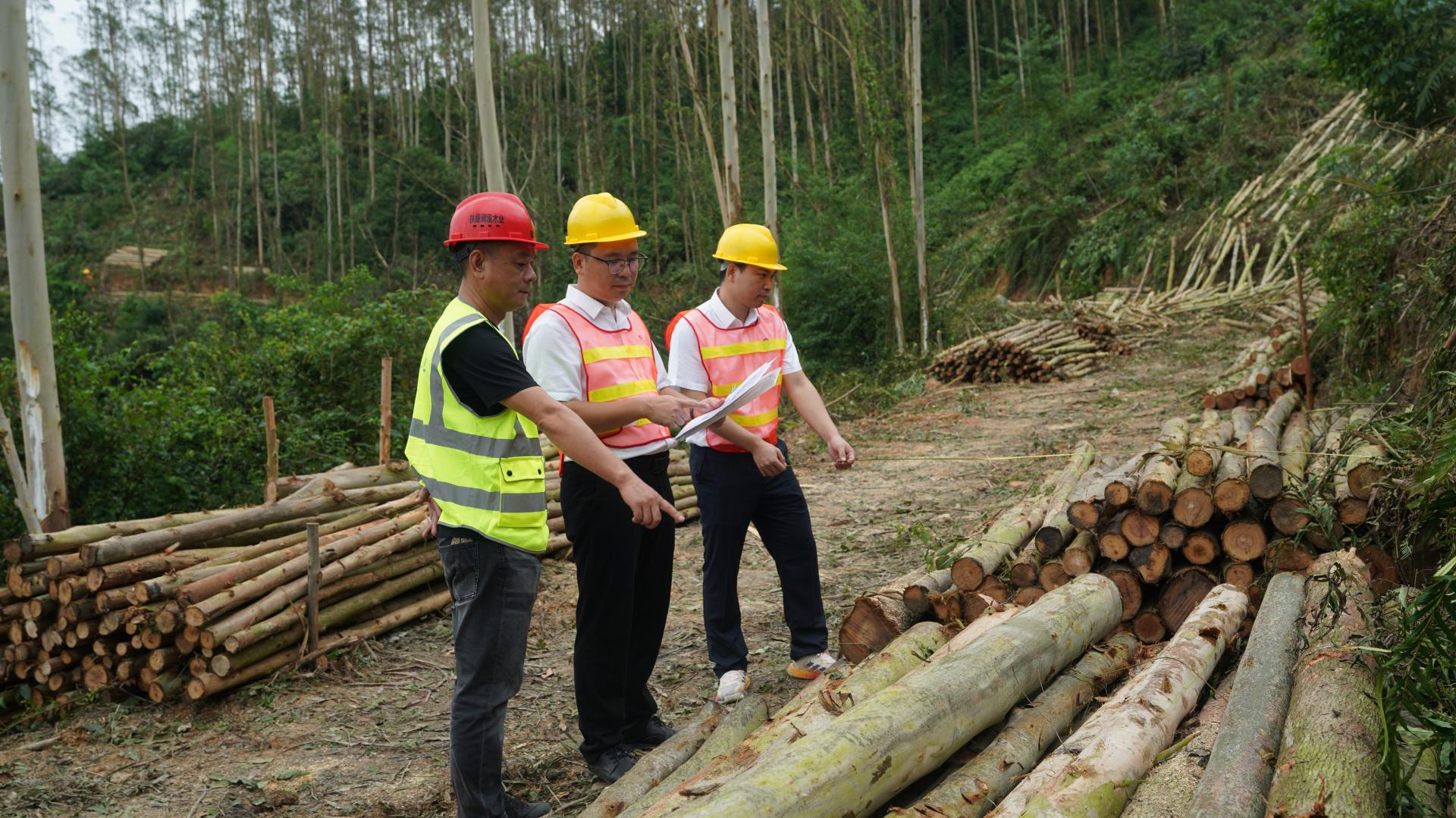 現(xiàn)場確認伐木區(qū)域及測量木材尺寸