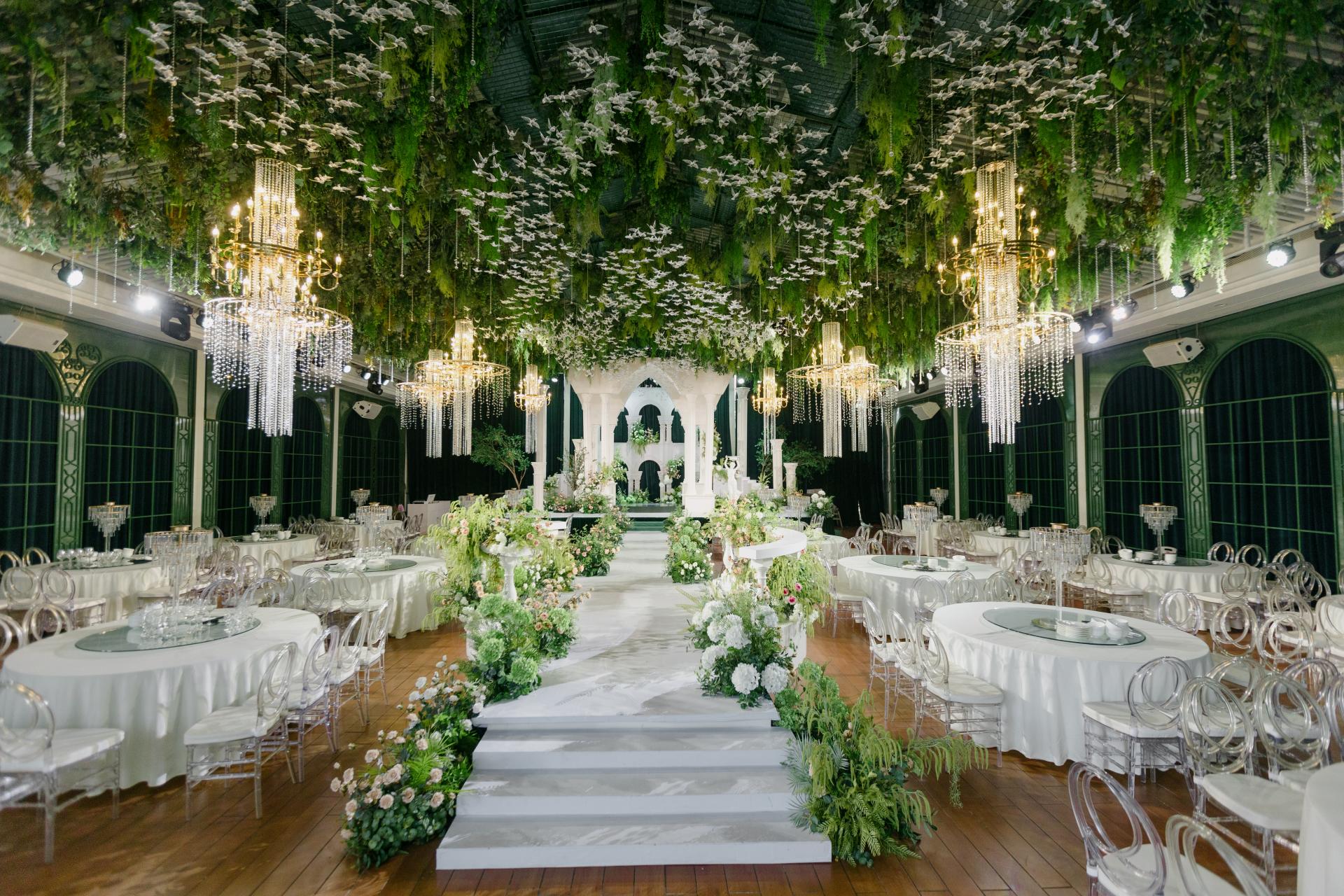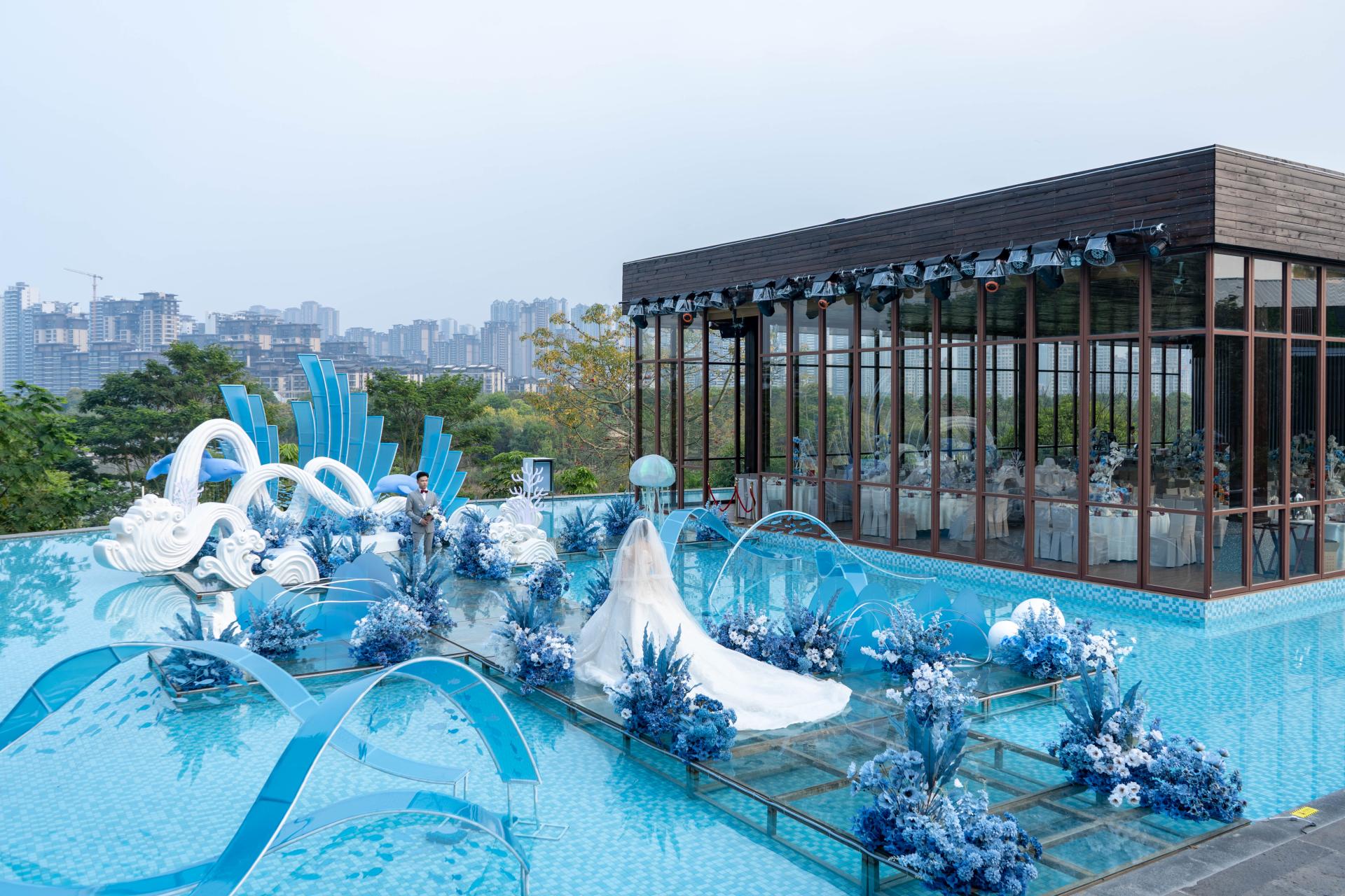 本次活動在8號樓湖畔禮堂舉行?;顒蝇F(xiàn)場布置得如夢似幻,藍(lán)白色系的場景布置營造出一種夢幻、空靈、清澈、純凈的氛圍,令人仿佛置身于童話世界。湖畔禮堂以其獨(dú)特的水上儀式區(qū)和三面通透的玻璃墻體設(shè)計,成為了現(xiàn)場的一大亮點(diǎn)。此外,五象山莊憑借無與倫比的自然景觀資源,精心打造了多個戶外草坪儀式區(qū),包括擁有超過1000平米的8號樓草坪和500平米的5號樓草坪,以及沉浸式婚禮堂花園廳、獨(dú)棟無柱式大宴會廳等,這些場地均以其開闊的視野、優(yōu)美的自然景觀和獨(dú)特的布置風(fēng)格,為新人及賓客提供了獨(dú)一無二的背景畫卷,讓每一場婚禮都能享受到專屬的私密空間與定制服務(wù),贏得了新人們的一致好評。