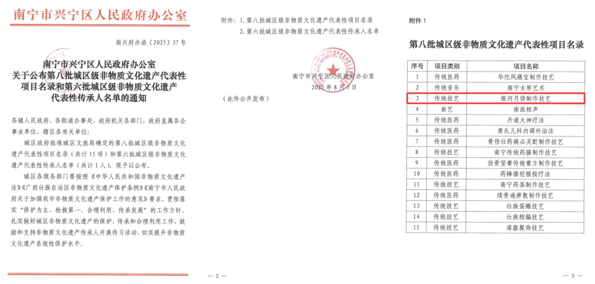 匠心傳承,文脈賡續(xù);文化根脈,再譜新篇。近日,南寧文旅集團(tuán)旗下銀河公司 “銀河月餅制作技藝” 正式入選南寧市興寧區(qū)第八批非物質(zhì)文化遺產(chǎn)代表性項(xiàng)目名錄。此前,銀河公司已獲自治區(qū)級非物質(zhì)文化遺產(chǎn)代表性項(xiàng)目 “南寧老友粉” 傳承基地稱號,其 “邕城涼茶制作技藝” 亦入選南寧市級非物質(zhì)文化遺產(chǎn)代表性項(xiàng)目。此次入選,是銀河公司在本土傳統(tǒng)技藝挖掘、保護(hù)與活化利用領(lǐng)域的又一重要成果,標(biāo)志著企業(yè)品牌文化底蘊(yùn)與核心競爭力的持續(xù)提升。