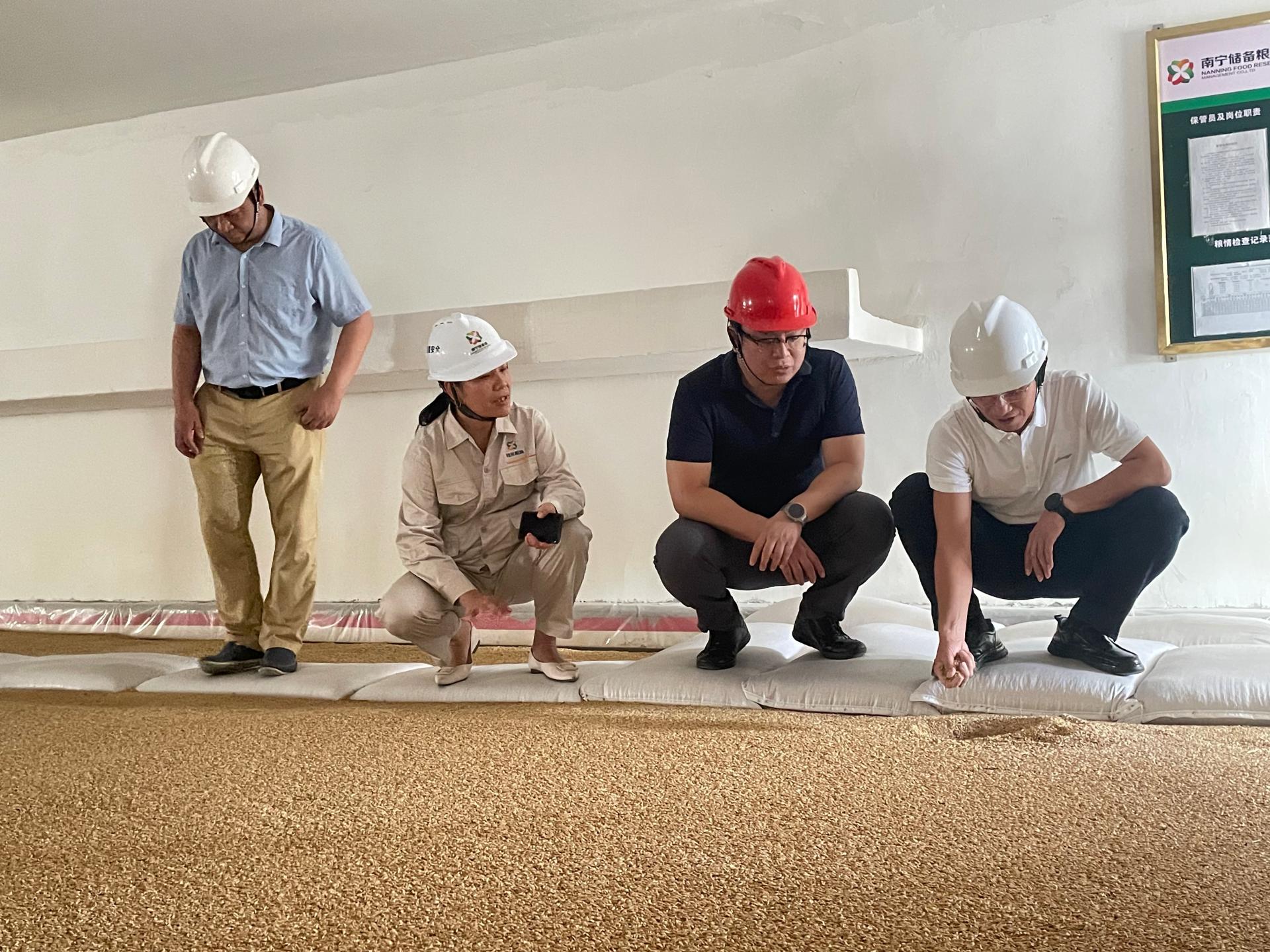 劉桂發(fā)一行先后深入儲備糧公司五象糧庫原糧倉、成品倉以及大米加工生產(chǎn)車間開展調(diào)研,實(shí)地查看原糧、成品糧存儲環(huán)境,詳細(xì)了解儲備糧溫濕調(diào)控、輪換出庫等工作細(xì)節(jié)。同時(shí),還現(xiàn)場觀摩了稻谷清理、脫殼、碾米等全流程生產(chǎn)環(huán)節(jié),了解加工生產(chǎn)設(shè)備運(yùn)行、產(chǎn)品質(zhì)量管控等情況,并就企業(yè)在原糧保管、應(yīng)急成品糧輪換管理面臨的問題和困難進(jìn)行深入交流。