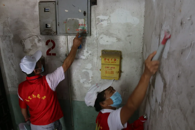 志愿者在清理老舊小區(qū)墻上的“牛皮癬”