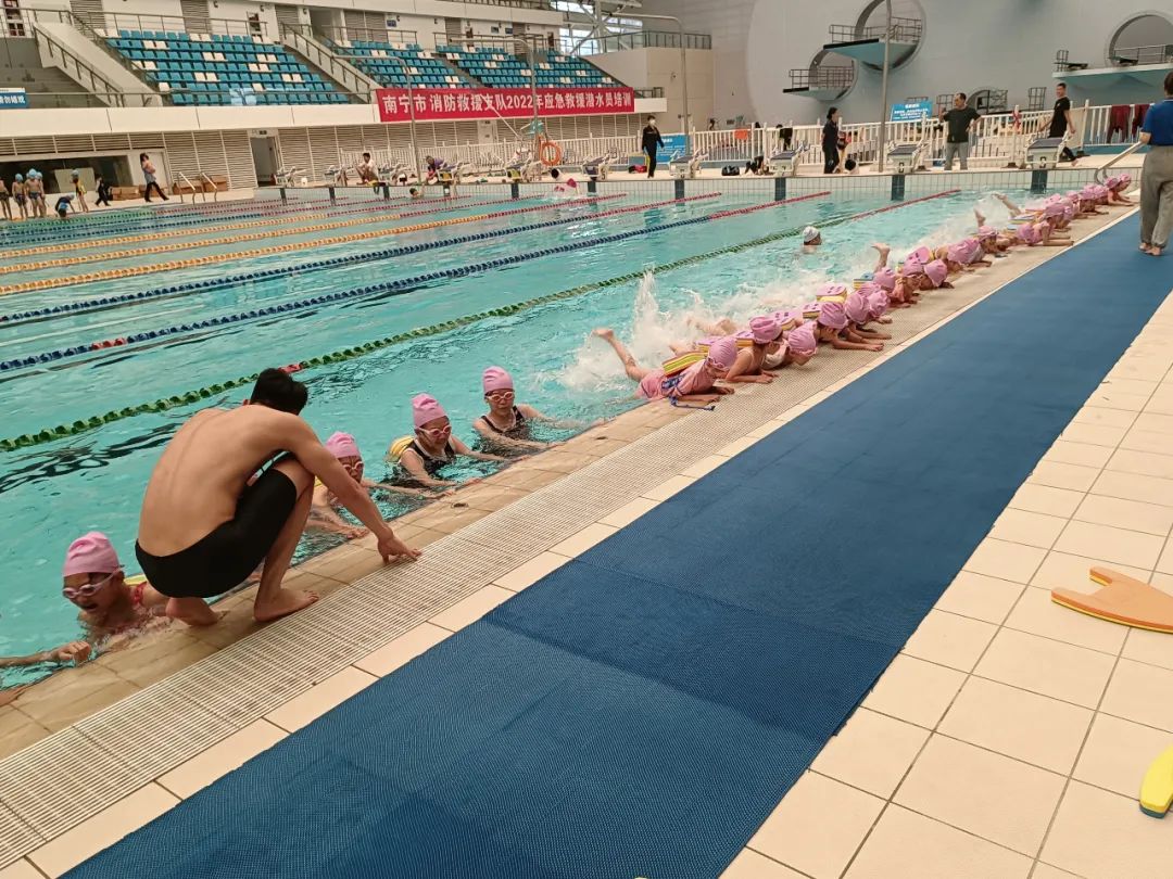 2022年5月21日上午,廣西體育中心游泳跳水館內(nèi)“人氣十足”,良慶鎮(zhèn)中心校約160名學(xué)生手拿浮板、身背背漂,穿著各式各色的泳衣,佩戴統(tǒng)一發(fā)放的泳鏡、泳帽,在教練的指導(dǎo)下進(jìn)行游泳基礎(chǔ)動(dòng)作訓(xùn)練。