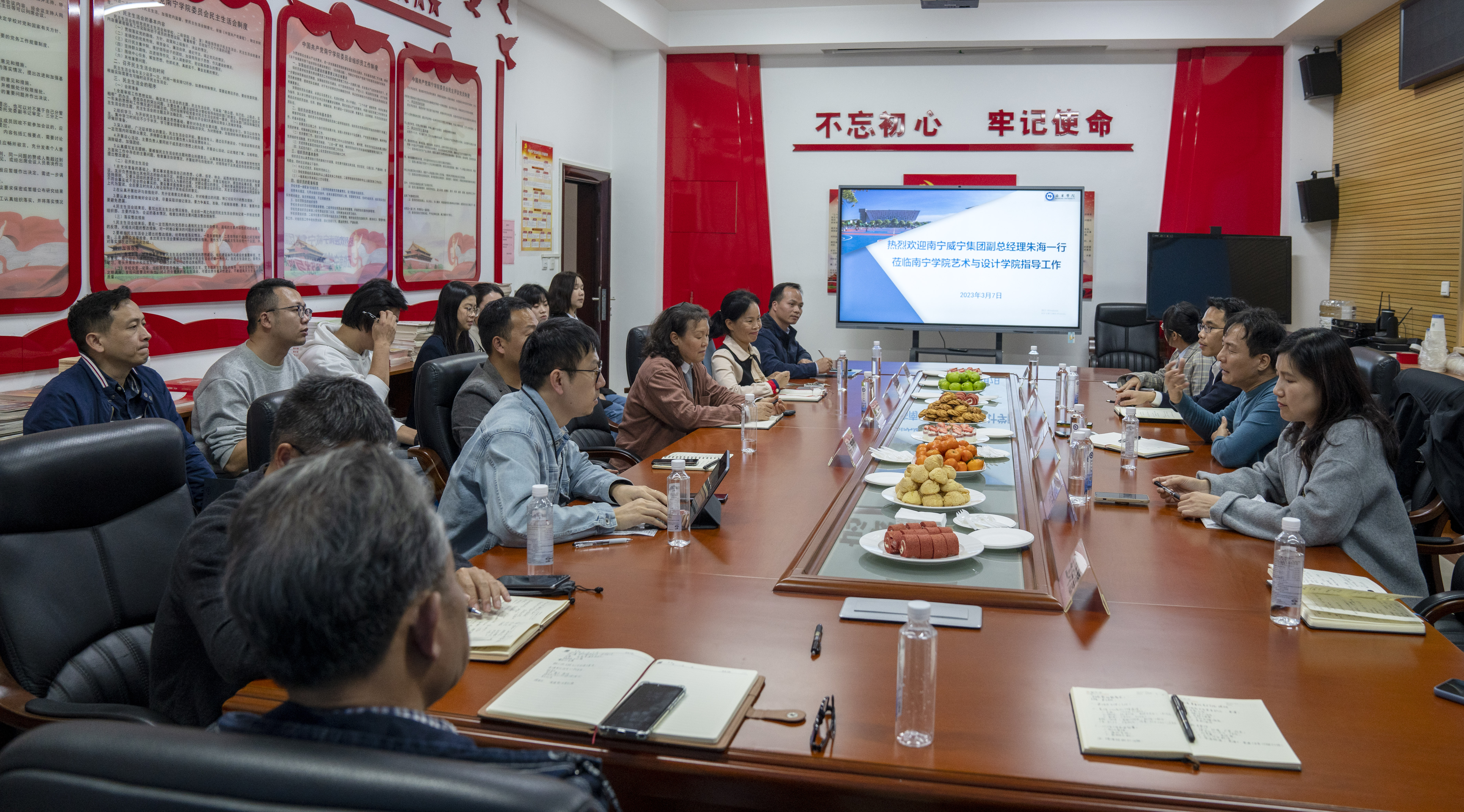 隨后,朱海一行與南寧學(xué)院相關(guān)領(lǐng)導(dǎo)及藝術(shù)與設(shè)計(jì)學(xué)院部分教師骨干召開(kāi)座談會(huì),并就南寧學(xué)院藝術(shù)與設(shè)計(jì)學(xué)院校企合作項(xiàng)目展開(kāi)深入研討。座談會(huì)上,朱海表示,威寧酒店公司近年來(lái)持續(xù)優(yōu)化經(jīng)營(yíng)布局,加大加快新業(yè)態(tài)培育,強(qiáng)化文化賦能,積極探索新的經(jīng)營(yíng)增長(zhǎng)點(diǎn),力求為公司高質(zhì)量發(fā)展注入新動(dòng)能、新活力。希望通過(guò)溝通交流,雙方能進(jìn)一步在校企合作方面打好合作共贏的“組合拳”,共同推動(dòng)特色課程開(kāi)發(fā)、人才培養(yǎng)、藝術(shù)作品落地門(mén)店等方面達(dá)成更多深層次的合作,取得更多實(shí)質(zhì)性成果。