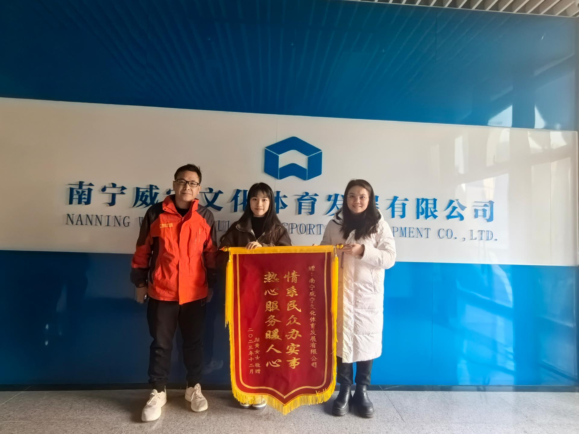 12月25日,一位在林俊杰演唱會上“失而復(fù)得”手機的觀眾給威寧文體公司送來一面錦旗,失主黃女士說,廣西體育中心給前來觀看演唱會的觀眾來帶溫暖貼心的服務(wù),讓我們感受到在這里舉辦的活動非常安全且有保障,可以盡情享受演唱會的熱烈氣氛!