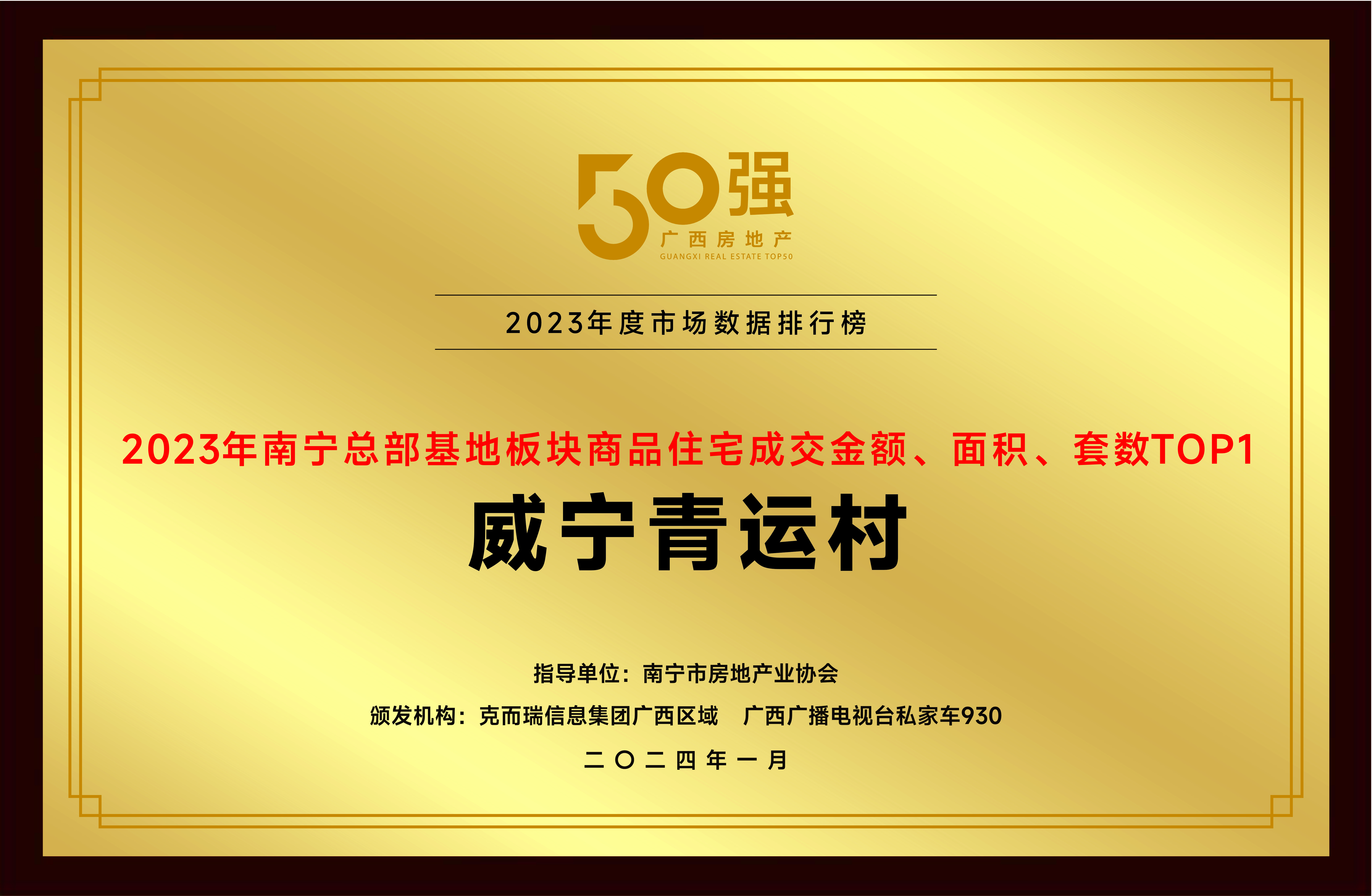 公司所屬項(xiàng)目威寧青運(yùn)村憑借良好的市場(chǎng)口碑,成功脫穎而出,獲“2023年廣西地產(chǎn)品質(zhì)標(biāo)桿項(xiàng)目”“2023年南寧商品房項(xiàng)目銷售金額TOP12”“2023年南寧總部基地板塊商品住宅成交金額、面積、套數(shù)TOP1”大獎(jiǎng),這也印證了威寧青運(yùn)村項(xiàng)目在市場(chǎng)的高關(guān)注度與認(rèn)可度。
