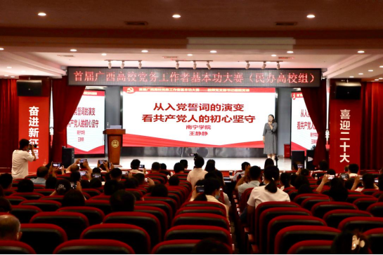 首屆廣西高校黨務(wù)工作者基本功大賽(民辦高校組)共吸引了來自全區(qū)18所民辦高校的52名選手同臺競技,各展風(fēng)采,互相切磋,各取所長。大賽共設(shè)教師黨支部書記、學(xué)生黨支部書記和專職組織員三個(gè)組別,每個(gè)組別各派1人參賽。我校選派的3位參賽選手在黨務(wù)知識測試、微黨課、黨建工作案例展示這3個(gè)環(huán)節(jié)的比拼中,充分展現(xiàn)了南寧學(xué)院黨務(wù)干部過硬的政治素養(yǎng)、扎實(shí)的理論功底、精湛的專業(yè)技能、優(yōu)秀的職業(yè)素養(yǎng)和豐碩的黨建成果,最終榮獲兩個(gè)一等獎、一個(gè)二等獎的好成績,其中王靜靜同志獲得全場最高分,并作為獲獎代表在閉幕式上進(jìn)行微黨課展示。