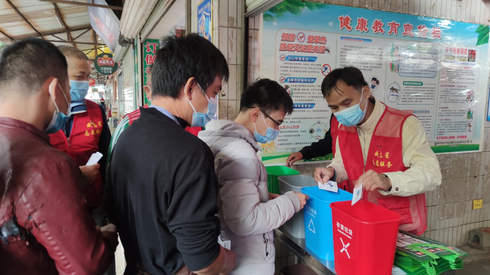活動(dòng)現(xiàn)場(chǎng),黨員志愿者化身“生活垃圾分類宣講員”,走攤?cè)脘佇麄髁私馐袌?chǎng)經(jīng)營(yíng)戶對(duì)垃圾分類的意見(jiàn)建議,向前來(lái)市場(chǎng)購(gòu)物的市民顧客發(fā)放垃圾分類宣傳冊(cè),講解生活垃圾的分類類別、投放方式以及有害垃圾的處理方法,同時(shí)開(kāi)展了垃圾分類知識(shí)競(jìng)答、模擬投放益智游戲活動(dòng),通過(guò)寓教于樂(lè)的方式,號(hào)召大家積極學(xué)習(xí)、掌握分類知識(shí),并正確引導(dǎo)身邊的人樹(shù)立垃圾分類意識(shí)。