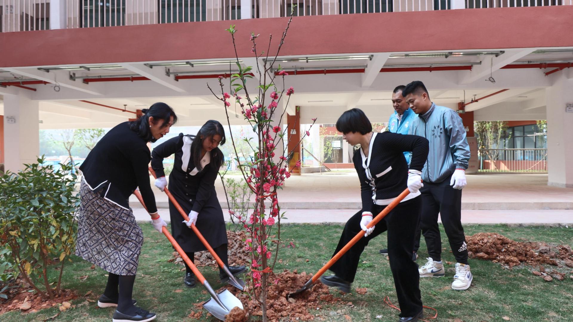 陽(yáng)春三月,威寧青運(yùn)村項(xiàng)目周圍春暖花開、吐露新綠,春花燦爛映襯著項(xiàng)目拔地而起的樓棟建筑,承托著鱗次櫛比的教育配套設(shè)施。本次植樹志愿活動(dòng),選取了南寧二中初中部(青運(yùn)校區(qū))、天桃實(shí)驗(yàn)學(xué)校小學(xué)部(青運(yùn)校區(qū))的兩個(gè)區(qū)域,種下桃樹和李樹共植青運(yùn)林,寓意在這學(xué)習(xí)工作的師生能桃李芬芳、教澤綿長(zhǎng)。