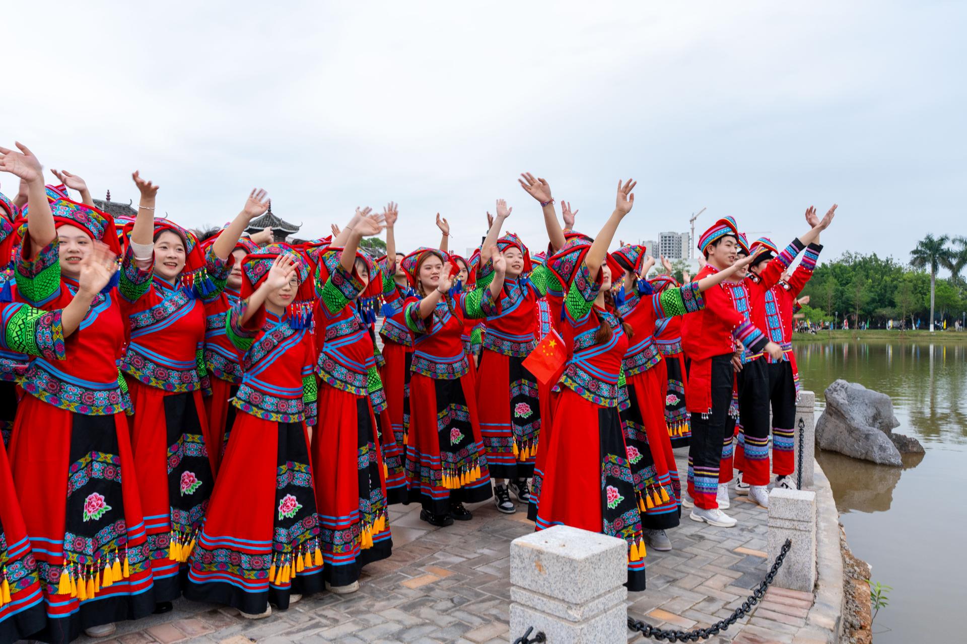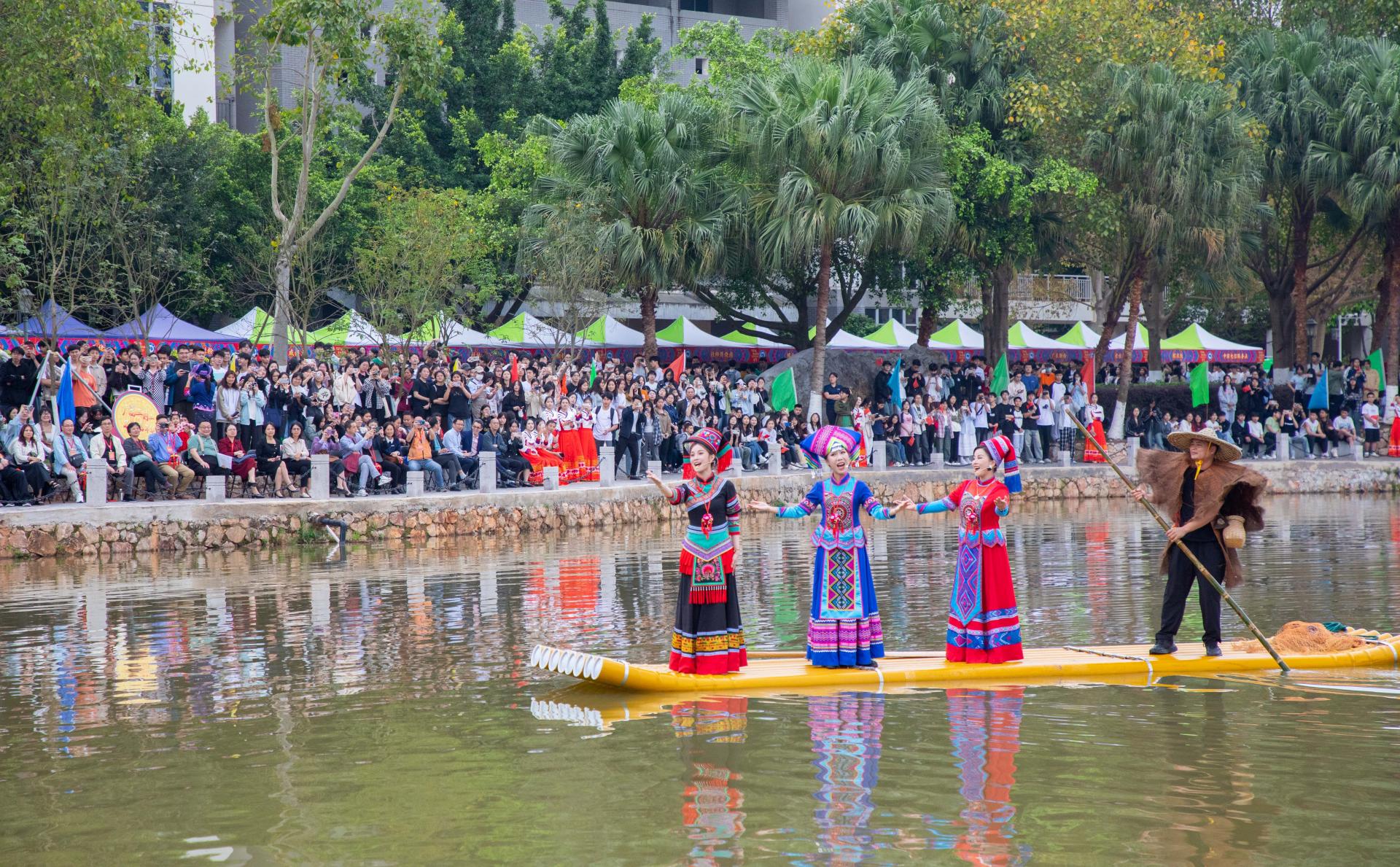 臨近傍晚的不孤湖畔,歡歌縈繞,熱鬧非凡。伴隨著熟悉的旋律,南院版“印象·劉三姐”隨后在此上演。演出由學(xué)校教育學(xué)院黃鈺善老師扮演的“劉三姐”從青秀風(fēng)雨橋下乘竹筏駛出開始,以《山歌好比春江水》一曲唱響不孤湖中央。其后由兩百余名學(xué)校不同年齡、不同地區(qū)、不同民族的表演者組成的民族歌陣,齊聲唱響代表著廣西三月三的耳熟能詳?shù)拿褡甯枨稄V西尼的呀》《三姐的歌萬人和》,生動展現(xiàn)了“壯族三月三”歌圩盛況?!拔疑洗荷郊s你來見,邀你一起馳騁躍馬揚鞭,青春無限正好揚帆,前路燦燦在南院……”南院版《上春山》展示了師生的美好愿景?,F(xiàn)場歡歌飛揚,激情回蕩。表演最后,現(xiàn)場觀眾一起揮舞手中的國旗,引吭高歌,合唱《歌唱祖國》,用歌聲表達對偉大祖國繁榮昌盛的美好祝愿,將會場活動推向高潮。