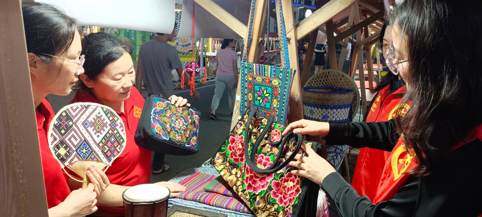 文創(chuàng)市集以展現(xiàn)廣西特色民族文化為核心,展品涵蓋非遺工藝、創(chuàng)意好物、國風藝術(shù)等品類。壯錦、繡球、銅鼓、花竹帽……各樣的民族特色物品陳列在展臺上,吸引群眾紛紛駐足了解,“威匠在線”志愿服務(wù)隊成員們細心為大家做民族特色物品講解,為群眾發(fā)放民族團結(jié)進步宣傳手冊,宣傳民族團結(jié)進步知識。