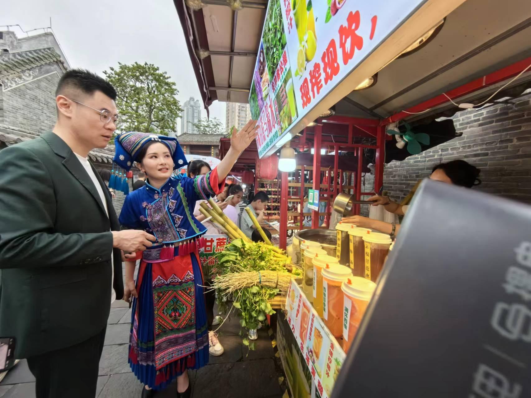 近年來,邕州古城·三街兩巷把非遺文化傳承保護作為鑄牢中華民族共同體意識的“粘合劑”,采用“非物質(zhì)文化遺產(chǎn)傳承+民族團結(jié)進步創(chuàng)建”模式,將非遺民族文化融入景區(qū)經(jīng)營,讓游客們在三街兩巷漫步時共享傳統(tǒng)打金技藝、邕劇等非遺盛宴。今年4月,邕州古城·三街兩巷作為第二屆中國-東盟(南寧)非物質(zhì)文化遺產(chǎn)周開幕式的舉辦點,以中國和東盟國家燦爛多元的非物質(zhì)文化遺產(chǎn)項目為載體,為眾多市民游客帶來了不同民族、不同國家的傳統(tǒng)戲劇、傳統(tǒng)音樂、傳統(tǒng)舞蹈等非遺項目文化體驗,讓民族團結(jié)之花在非遺傳承中盛放。