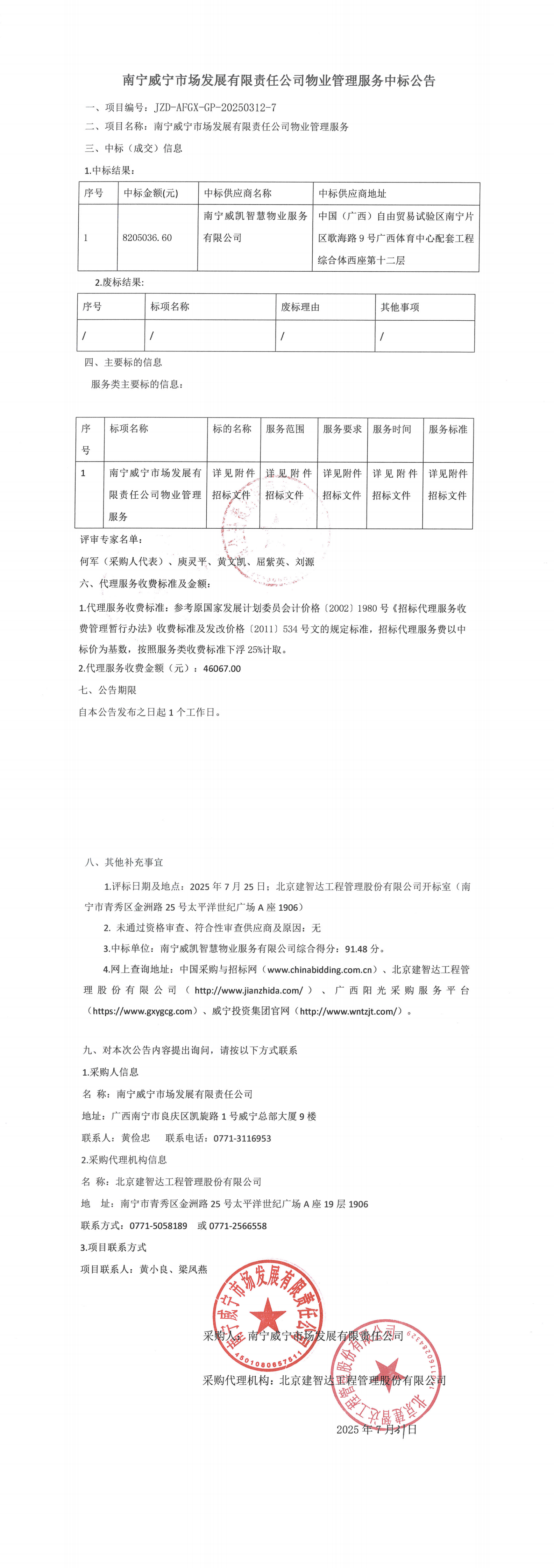 南寧威寧市場(chǎng)發(fā)展有限責(zé)任公司物業(yè)管理服務(wù)中標(biāo)公告