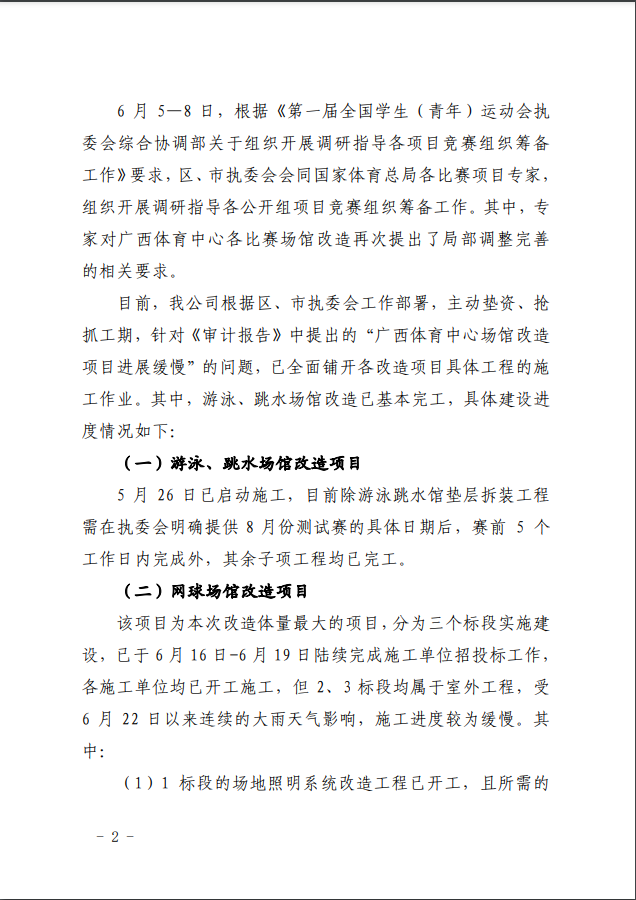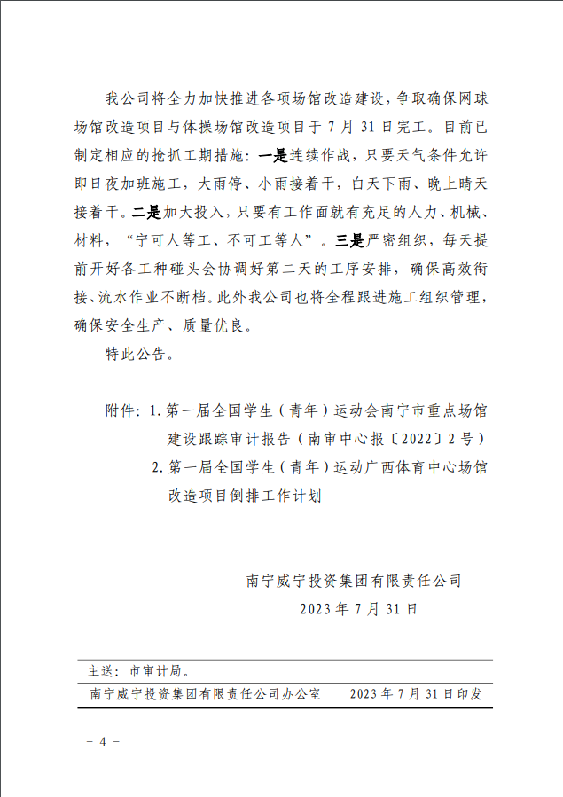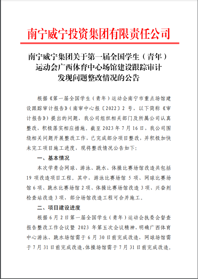 南寧威寧集團(tuán)關(guān)于第一屆全國(guó)學(xué)生(青年)運(yùn)動(dòng)會(huì)廣西體育中心場(chǎng)館建設(shè)跟蹤審計(jì)發(fā)現(xiàn)問題整改情況的公告