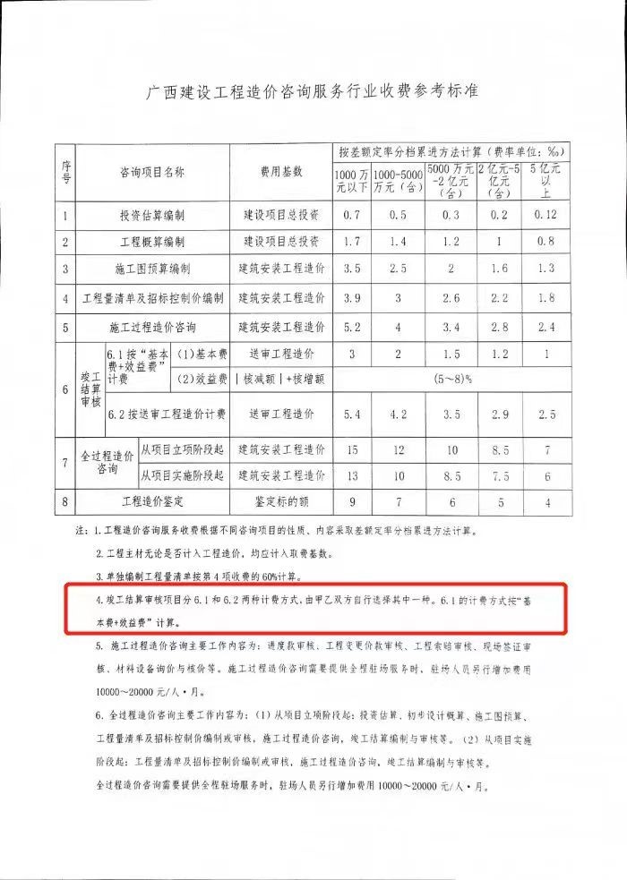 根據(jù)《廣西建設(shè)工程造價(jià)咨詢服務(wù)行業(yè)收費(fèi)參考標(biāo)準(zhǔn)》桂價(jià)協(xié)字[2019]15號(hào)中竣工結(jié)算審核項(xiàng)目6.1進(jìn)行計(jì)費(fèi) |