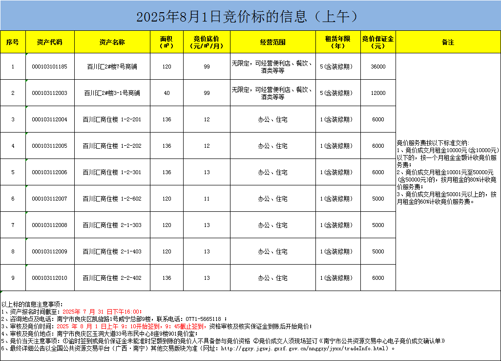 2025年8月1日競(jìng)價(jià)標(biāo)的信息(現(xiàn)場(chǎng)競(jìng)價(jià))