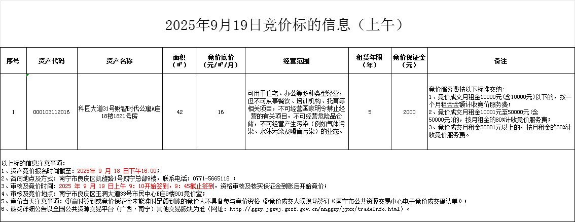 2025年9月19日競價(jià)標(biāo)的信息(現(xiàn)場競價(jià))