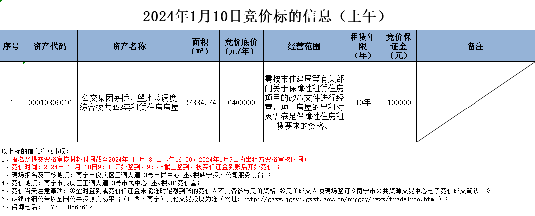 2024年1月10日競價標的信息