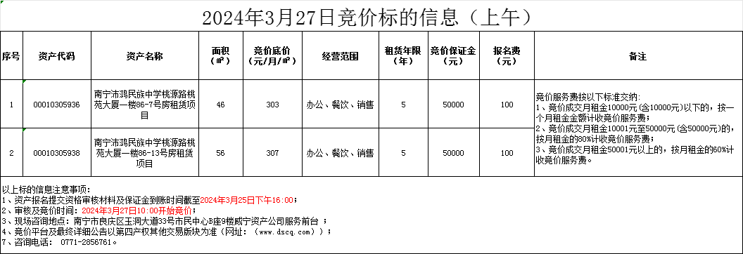 2024年3月27日競(jìng)價(jià)標(biāo)的信息(線上競(jìng)價(jià))