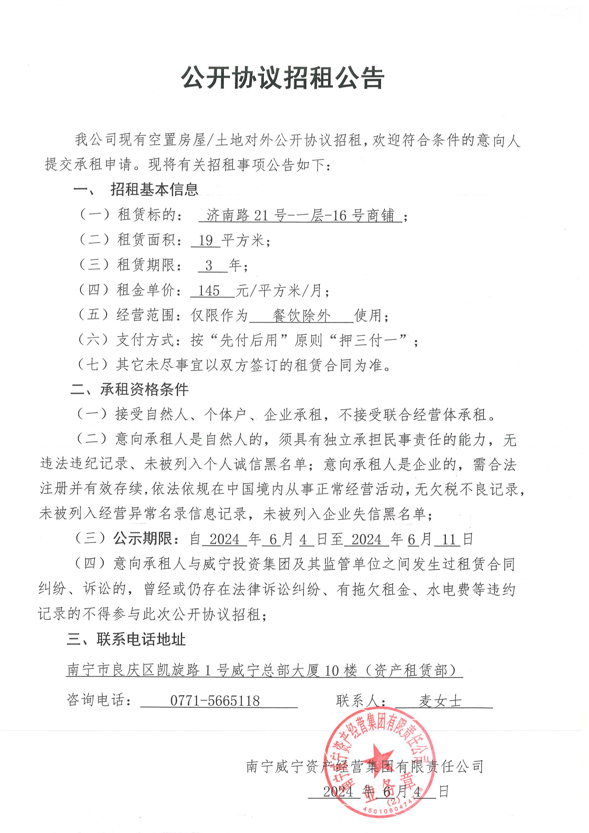 濟(jì)南路21號(hào)-一層-16號(hào)商鋪公開(kāi)協(xié)議招租公告
