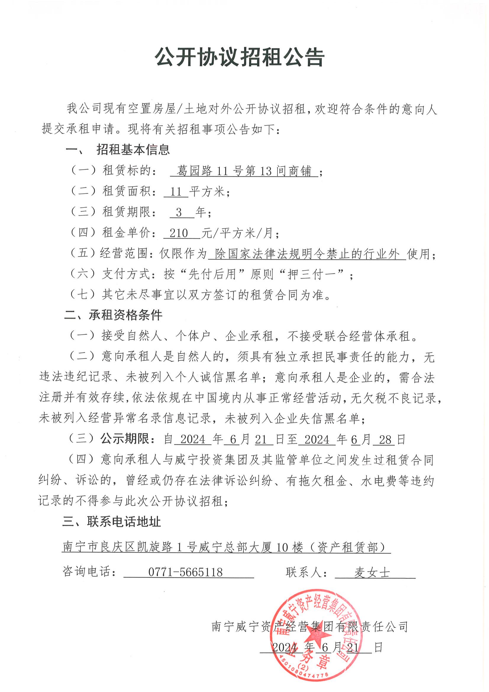 葛園路11號(hào)第13間商鋪公開(kāi)協(xié)議招租公告