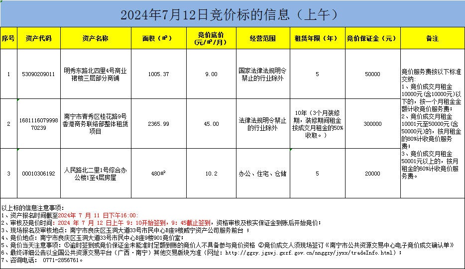 2024年7月12日競價標的信息(現(xiàn)場競價)
