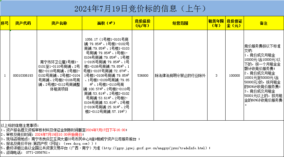 2024年7月19日競(jìng)價(jià)標(biāo)的信息(線上競(jìng)價(jià))