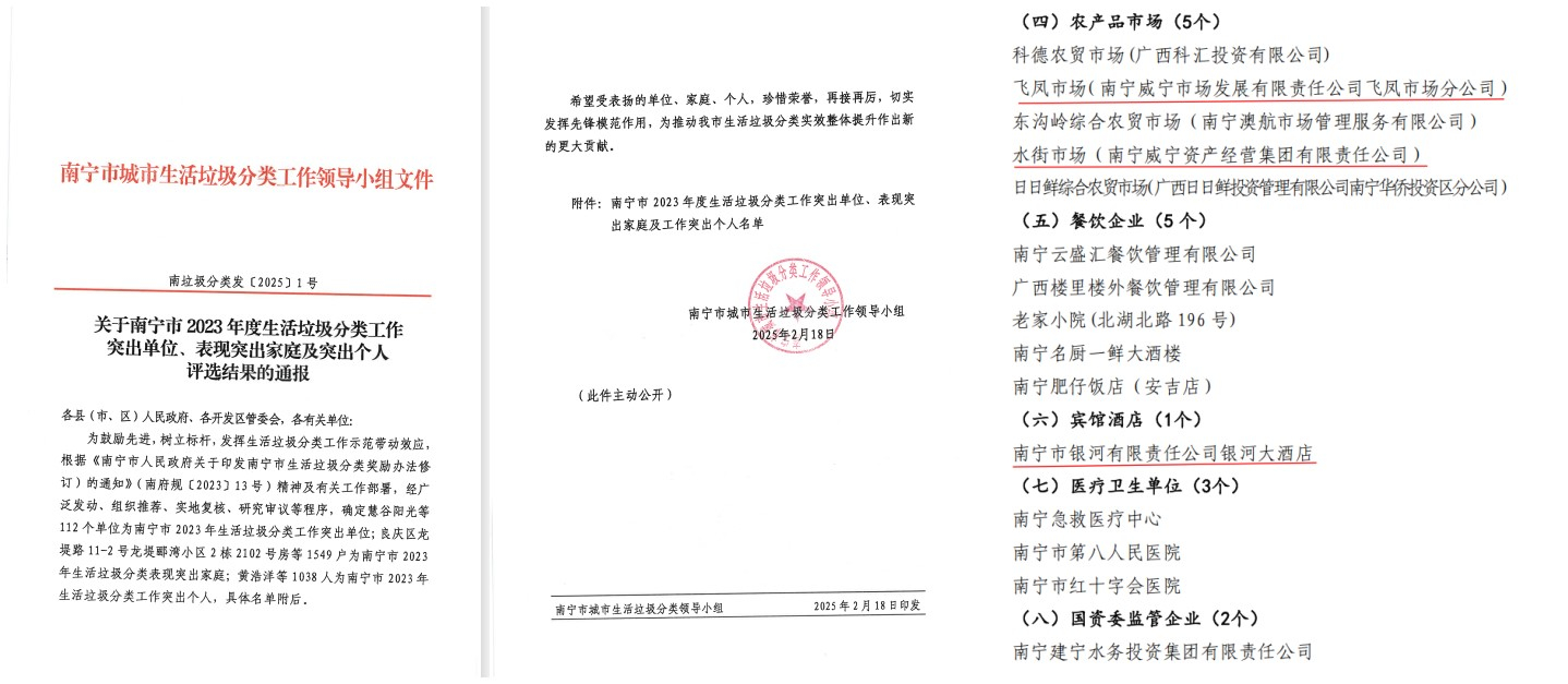 近日,南寧市生活垃圾分類辦發(fā)布通報,威寧資產(chǎn)經(jīng)營集團(tuán)下屬企業(yè)威寧市場公司所屬飛鳳市場、水街市場2個農(nóng)貿(mào)市場連續(xù)兩年榮獲南寧市生活垃圾分類“工作突出單位”,威寧市場公司員工廖麗萍被評為南寧市2023年生活垃圾分類“工作突出個人”。