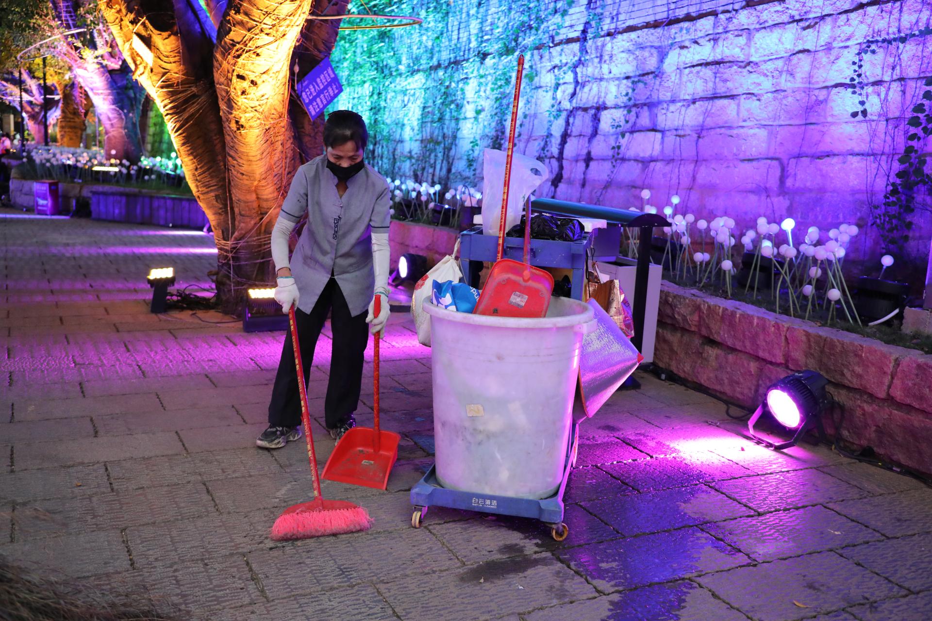 為保障光影演繹活動區(qū)域周邊環(huán)境衛(wèi)生干凈整潔有序,威邕文旅集團組織保潔團隊,全程做好活動區(qū)域環(huán)境衛(wèi)生保障工作。