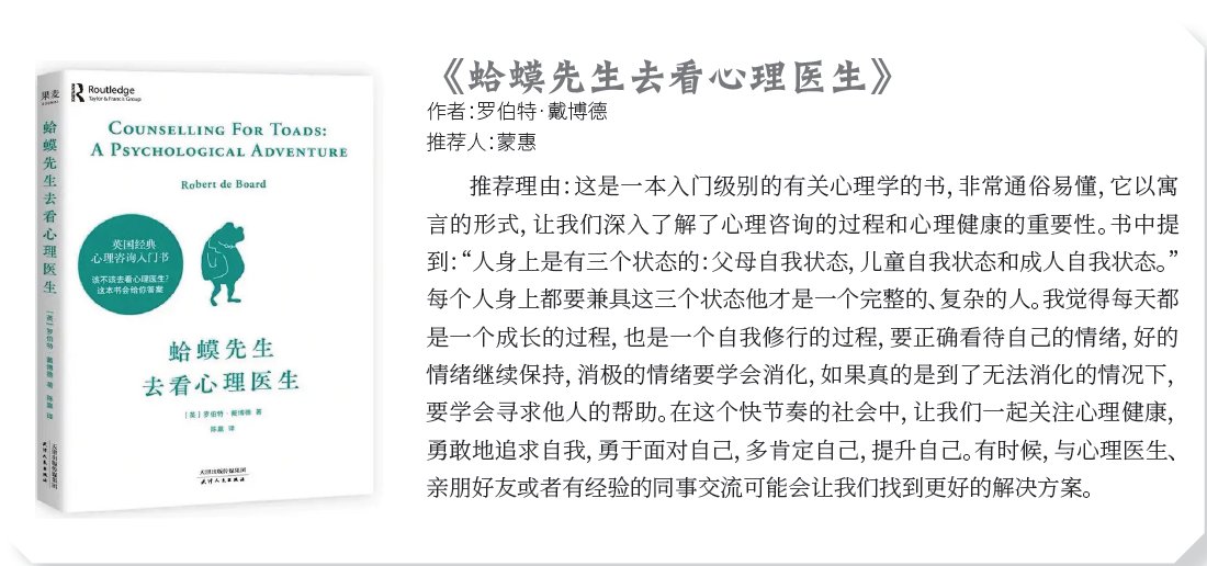 作者:羅伯特·戴博德 推薦人:蒙惠 推薦理由:這是一本入門(mén)級(jí)別的有關(guān)心理學(xué)的書(shū),非常通俗易懂,它以寓 言的形式,讓我們深入了解了心理咨詢(xún)的過(guò)程和心理健康的重要性。書(shū)中提 到:“人身上是有三個(gè)狀態(tài)的:父母自我狀態(tài),兒童自我狀態(tài)和成人自我狀態(tài)?!? 每個(gè)人身上都要兼具這三個(gè)狀態(tài)他才是一個(gè)完整的、復(fù)雜的人。我覺(jué)得每天都 是一個(gè)成長(zhǎng)的過(guò)程,也是一個(gè)自我修行的過(guò)程,要正確看待自己的情緒,好的 情緒繼續(xù)保持,消極的情緒要學(xué)會(huì)消化,如果真的是到了無(wú)法消化的情況下, 要學(xué)會(huì)尋求他人的幫助。在這個(gè)快節(jié)奏的社會(huì)中,讓我們一起關(guān)注心理健康, 勇敢地追求自我,勇于面對(duì)自己,多肯定自己,提升自己。有時(shí)候,與心理醫(yī)生、 親朋好友或者有經(jīng)驗(yàn)的同事交流可能會(huì)讓我們找到更好的解決方案。