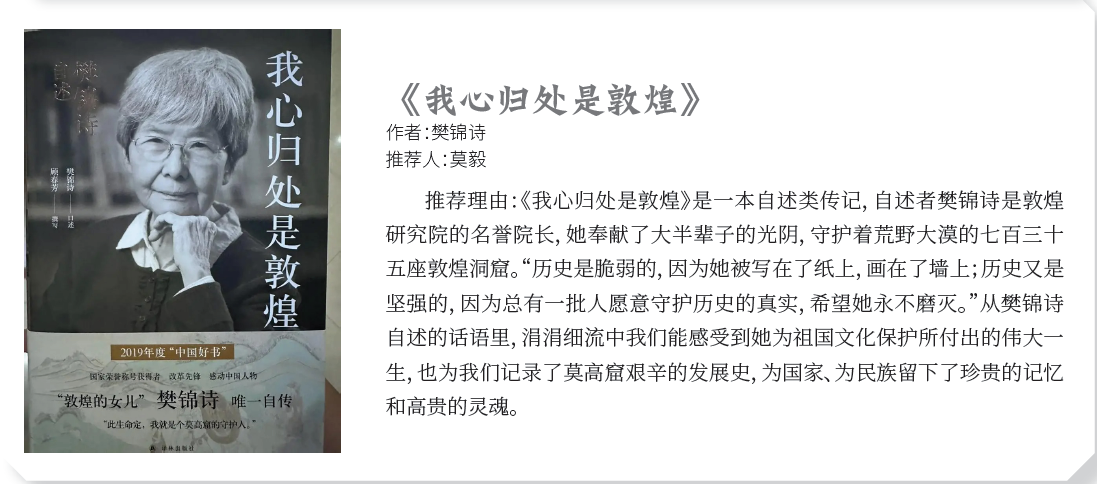 作者:樊錦詩(shī) 推薦人:莫毅 推薦理由:《我心歸處是敦煌》是一本自述類(lèi)傳記,自述者樊錦詩(shī)是敦煌 研究院的名譽(yù)院長(zhǎng),她奉獻(xiàn)了大半輩子的光陰,守護(hù)著荒野大漠的七百三十 五座敦煌洞窟?!皻v史是脆弱的,因?yàn)樗粚?xiě)在了紙上,畫(huà)在了墻上;歷史又是 堅(jiān)強(qiáng)的,因?yàn)榭傆幸慌嗽敢馐刈o(hù)歷史的真實(shí),希望她永不磨滅。”從樊錦詩(shī) 自述的話語(yǔ)里,涓涓細(xì)流中我們能感受到她為祖國(guó)文化保護(hù)所付出的偉大一 生,也為我們記錄了莫高窟艱辛的發(fā)展史,為國(guó)家、為民族留下了珍貴的記憶 和高貴的靈魂。