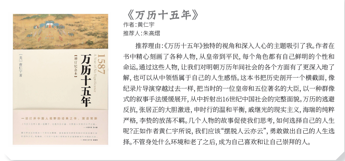 作者:黃仁宇 推薦人:朱高熠 推薦理由:《萬(wàn)歷十五年》獨(dú)特的視角和深入人心的主題吸引了我。作者在 書(shū)中精心刻畫(huà)了各種人物,從皇帝到平民,每個(gè)角色都有自己鮮明的個(gè)性和 命運(yùn)。通過(guò)這些人物,讓我們對(duì)明朝萬(wàn)歷年間社會(huì)的各個(gè)方面有了更深入地了 解,也可以從中領(lǐng)悟?qū)儆谧约旱娜松形?。這本書(shū)把歷史剖開(kāi)一個(gè)橫截面,像 紀(jì)錄片導(dǎo)演穿越過(guò)去一樣,把當(dāng)時(shí)的一位皇帝和五位著名的大臣,以一種群像 式的敘事手法緩緩展開(kāi),從中折射出16世紀(jì)中國(guó)社會(huì)的完整面貌。萬(wàn)歷的逃避 反抗,張居正的大膽激進(jìn),申時(shí)行的溫和平衡,戚繼光的現(xiàn)實(shí)主義,海瑞的純粹 嚴(yán)格,李贄的放蕩不羈。幾個(gè)人物的故事促使我們思考,如何選擇自己的人生 呢?正如作者黃仁宇所說(shuō),我們應(yīng)該“擺脫人云亦云”,勇敢做出自己的人生選 擇。不管身處什么環(huán)境和老了之后,成為自己喜歡和讓自己崇拜的人。