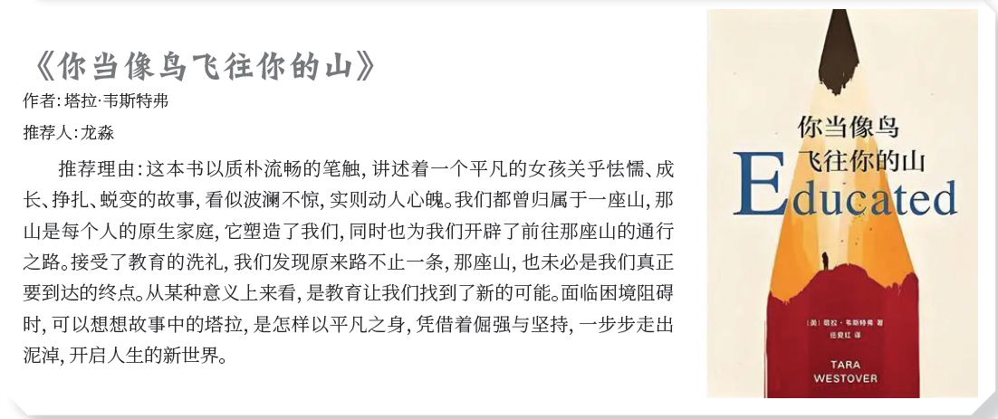 作者:塔拉·韋斯特弗 推薦人:龍淼 推薦理由:這本書(shū)以質(zhì)樸流暢的筆觸,講述著一個(gè)平凡的女孩關(guān)乎怯懦、成 長(zhǎng)、掙扎、蛻變的故事,看似波瀾不驚,實(shí)則動(dòng)人心魄。我們都曾歸屬于一座山,那 山是每個(gè)人的原生家庭,它塑造了我們,同時(shí)也為我們開(kāi)辟了前往那座山的通行 之路。接受了教育的洗禮,我們發(fā)現(xiàn)原來(lái)路不止一條,那座山,也未必是我們真正 要到達(dá)的終點(diǎn)。從某種意義上來(lái)看,是教育讓我們找到了新的可能。面臨困境阻礙 時(shí),可以想想故事中的塔拉,是怎樣以平凡之身,憑借著倔強(qiáng)與堅(jiān)持,一步步走出 泥淖,開(kāi)啟人生的新世界。