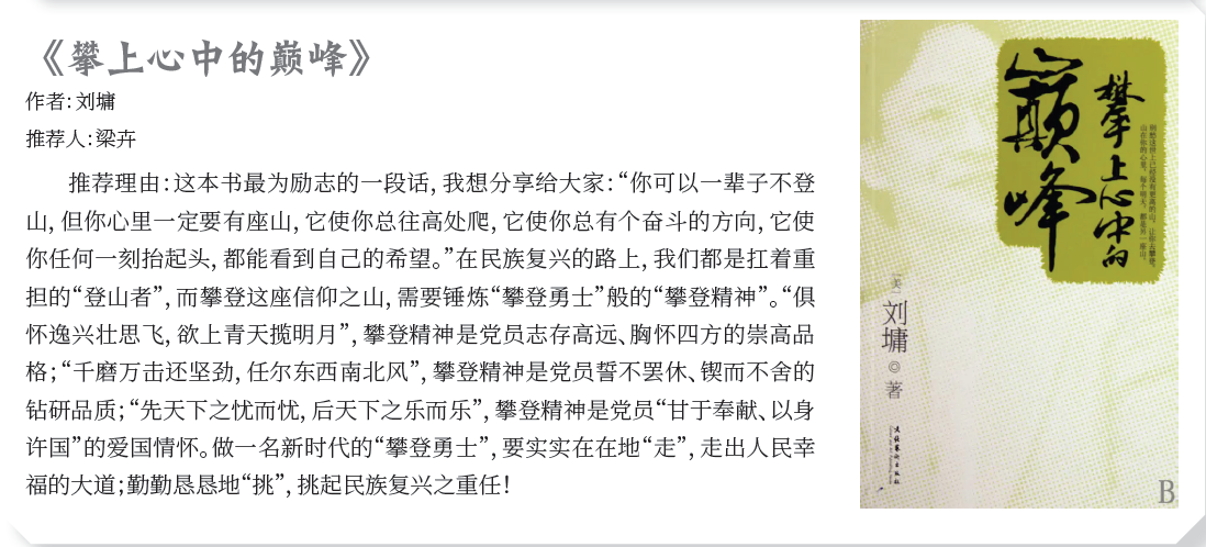 作者:劉墉 推薦人:梁卉 推薦理由:這本書(shū)最為勵(lì)志的一段話,我想分享給大家:“你可以一輩子不登 山,但你心里一定要有座山,它使你總往高處爬,它使你總有個(gè)奮斗的方向,它使 你任何一刻抬起頭,都能看到自己的希望。”在民族復(fù)興的路上,我們都是扛著重 擔(dān)的“登山者”,而攀登這座信仰之山,需要錘煉“攀登勇士”般的“攀登精神”?!熬? 懷逸興壯思飛,欲上青天攬明月”,攀登精神是黨員志存高遠(yuǎn)、胸懷四方的崇高品 格;“千磨萬(wàn)擊還堅(jiān)勁,任爾東西南北風(fēng)”,攀登精神是黨員誓不罷休、鍥而不舍的 鉆研品質(zhì);“先天下之憂(yōu)而憂(yōu),后天下之樂(lè)而樂(lè)”,攀登精神是黨員“甘于奉獻(xiàn)、以身 許國(guó)”的愛(ài)國(guó)情懷。做一名新時(shí)代的“攀登勇士”,要實(shí)實(shí)在在地“走”,走出人民幸 福的大道;勤勤懇懇地“挑”,挑起民族復(fù)興之重任!