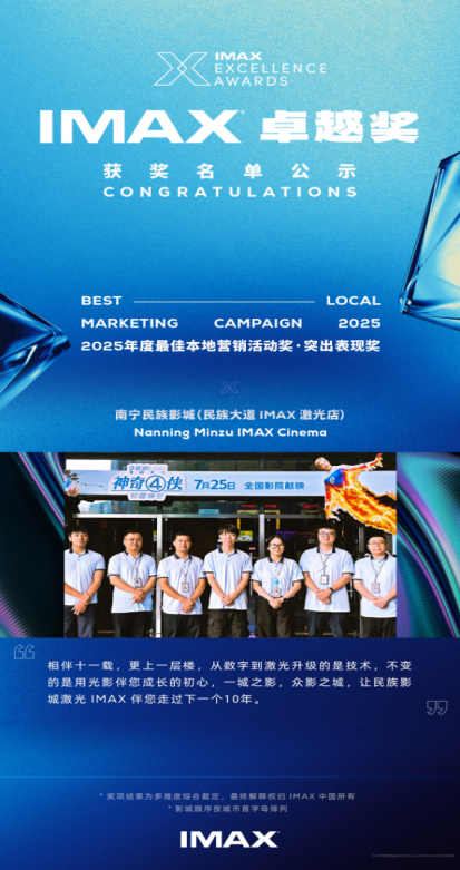 ?南寧民族影城(民族大道IMAX激光店)榮獲全球首屆IMAX卓越獎(jiǎng)2024-2025年度,IMAX公司首次面向全球影院合作伙伴推出“卓越獎(jiǎng)”評(píng)選活動(dòng),這一計(jì)劃旨在樹立全球IMAX影城在商業(yè)表現(xiàn)層面的“黃金標(biāo)準(zhǔn)”,表彰為IMAX全球網(wǎng)絡(luò)帶來(lái)突出價(jià)值的影城團(tuán)隊(duì)。在此次激烈的評(píng)選中,南寧民族影城(民族大道IMAX激光店)憑借著在市場(chǎng)活動(dòng)中展現(xiàn)出的卓越策劃與高效執(zhí)行能力,在全球眾多的IMAX影院中脫穎而出,榮獲“最佳本地營(yíng)銷活動(dòng)獎(jiǎng)?突出表...