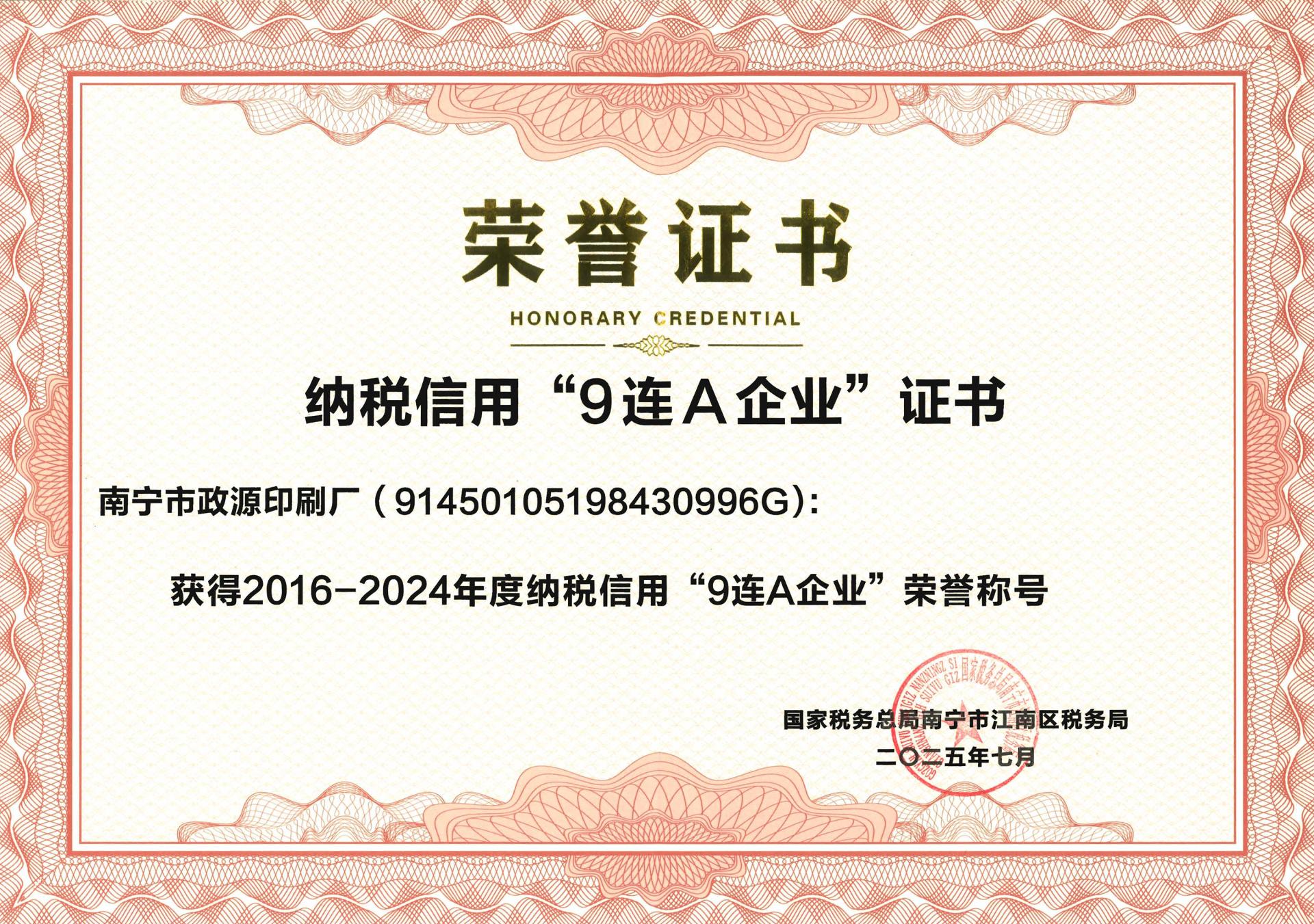 連續(xù)9年!南寧市政源印刷廠喜獲2016-2024年度納稅信用“9連A企業(yè)”榮譽稱號