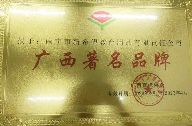 2020年4月,廣西商標(biāo)協(xié)會正式授予南寧市新希望教育用品有限責(zé)任公司及其持有的商標(biāo)為“廣西著名品牌”,這是對新希望公司二十余年發(fā)展和工作充分的肯定。