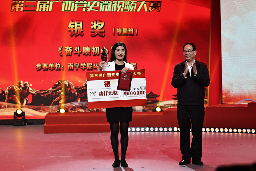 獲獎代表上臺領(lǐng)獎頒獎現(xiàn)場合影近日,“信仰伴我成長”第三屆廣西黨史微視頻大賽頒獎典禮在南寧舉行,南寧學(xué)院選送的作品《奮斗映初心》獲得校園組銀獎的好成績。“信仰伴我成長”第三屆廣西黨史微視頻大賽由廣西壯族自治區(qū)黨委黨史研究室、廣西壯族自治區(qū)文化和旅游廳、廣西廣播電視臺聯(lián)合主辦,主要以制作微視頻、微紀(jì)錄為創(chuàng)作方向,通過 “新媒體矩陣”活動平臺廣泛宣傳傳播。大賽主題圍繞廣西黨史上的事件、人物,結(jié)合當(dāng)下抗擊