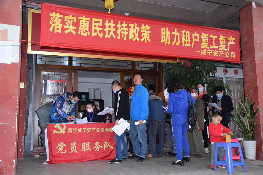 復工復產政策指導辦理不動產權證自新冠疫情發(fā)生以來,威寧資產公司在南寧市委市政府以及市國資委、南寧威寧集團大力來支持下,積極響應國家“六穩(wěn)”“六保”號召,堅持以務實高效的工作作風詮釋使命擔當,全面履行國有企業(yè)的經濟責任、政治責任和社會責任,為奪取疫情防控和經濟社會發(fā)展雙勝利貢獻力量。內外齊力,減租免租顯擔當。受新冠肺炎疫情影響,不少承租商戶延遲復工時間,租金支出壓力巨大。面對疫情,公司黨委要求業(yè)務部