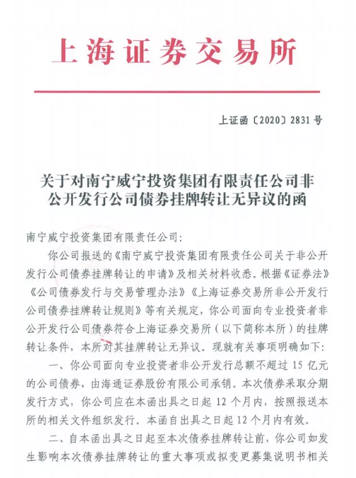 2020年12月17日,集團(tuán)收到上海證券交易所(以下簡稱“上交所”)《關(guān)于對南寧威寧投資集團(tuán)有限責(zé)任公司非公開發(fā)行公司債券掛牌轉(zhuǎn)讓無異議的函》,成功申報15億元私募公司債發(fā)行額度。