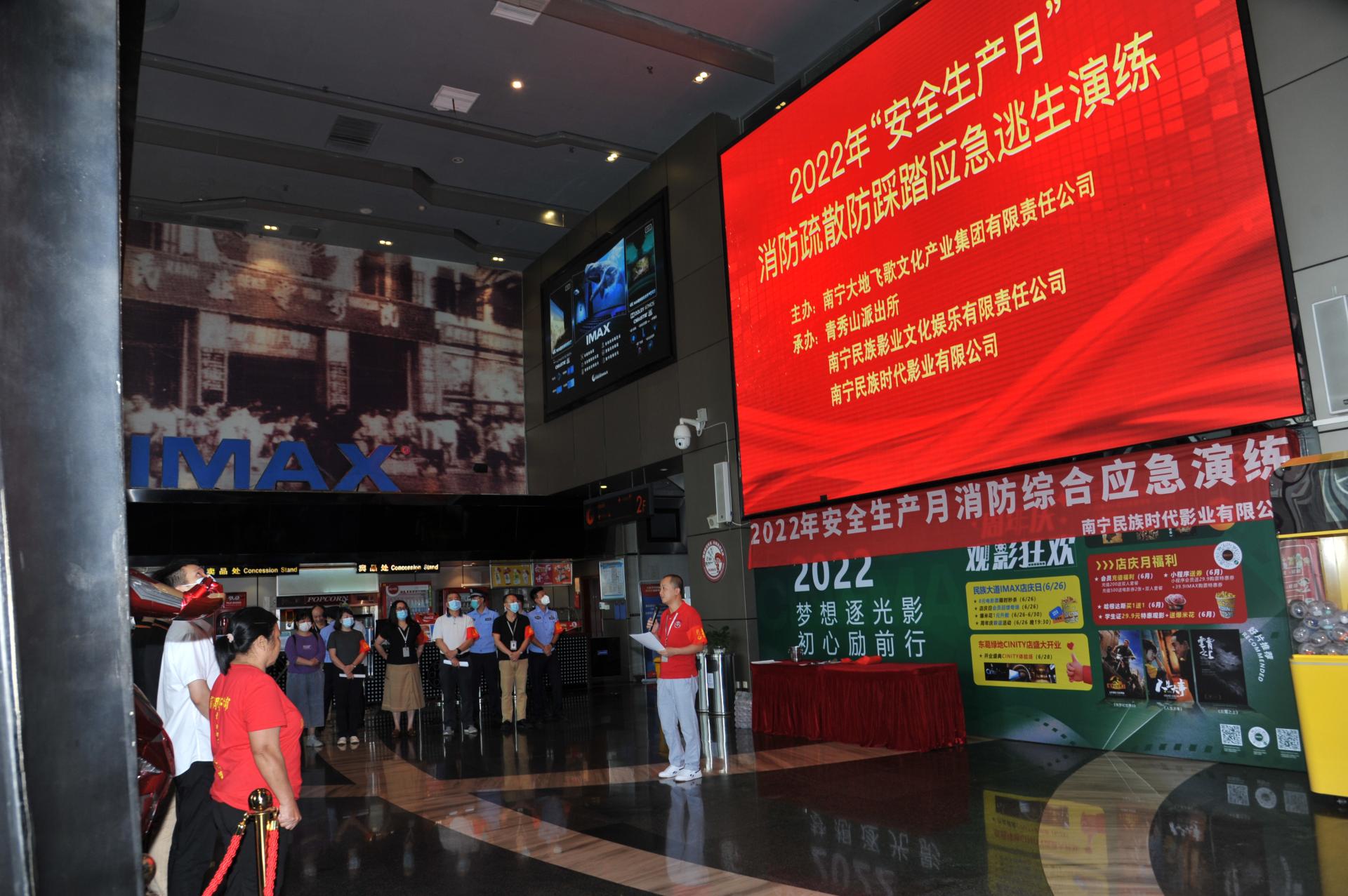 由南寧大地飛歌文化集團(tuán)有限責(zé)任公司主辦(下稱南寧大地飛歌集團(tuán)公司)、青秀山派出所、南寧民族影業(yè)文化娛樂(lè)有限責(zé)任公司(下稱民影公司)、南寧民族時(shí)代影業(yè)有限公司(下稱時(shí)代公司)聯(lián)合承辦的2022年“安全生產(chǎn)月”消防疏散防踩踏應(yīng)急逃生演練,于2022年6月22日上午在民族影城舉行。南寧大地飛歌集團(tuán)公司各部門(mén)負(fù)責(zé)人及員工、青秀山派出所部分民警、民影公司、時(shí)代公司全體人員、一分公司、影城各租賃企業(yè)(商戶)部...