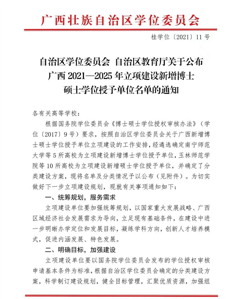 近日,廣西自治區(qū)學(xué)位委員會(huì)下發(fā)《自治區(qū)學(xué)位委員會(huì)自治區(qū)教育廳關(guān)于公布廣西2021-2025年立項(xiàng)建設(shè)新增博士碩士學(xué)位授予單位名單的通知》,共有10所高校獲批成為立項(xiàng)建設(shè)新增碩士學(xué)位授予單位,南寧學(xué)院名列其中。