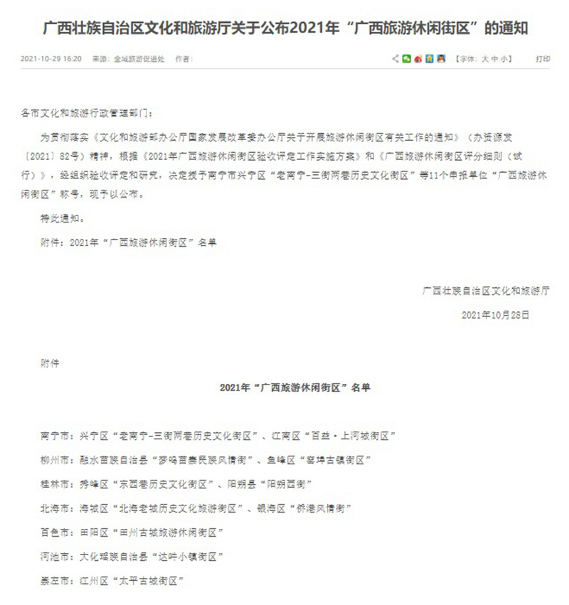 近日,廣西壯族自治區(qū)文旅廳公布2021年“廣西旅游休閑街區(qū)”名單,“老南寧·三街兩巷”歷史文化街區(qū)等11個項(xiàng)目成功入選。