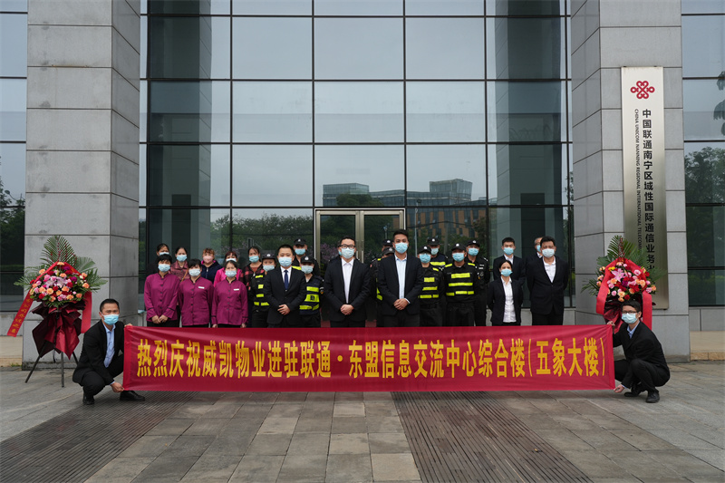 2022年3月31日下午,威凱智慧物業(yè)在中國聯(lián)通廣西分公司東盟信息交流中心綜合樓(以下簡稱“中國聯(lián)通五象大樓”)中庭廣場舉行了進駐儀式。