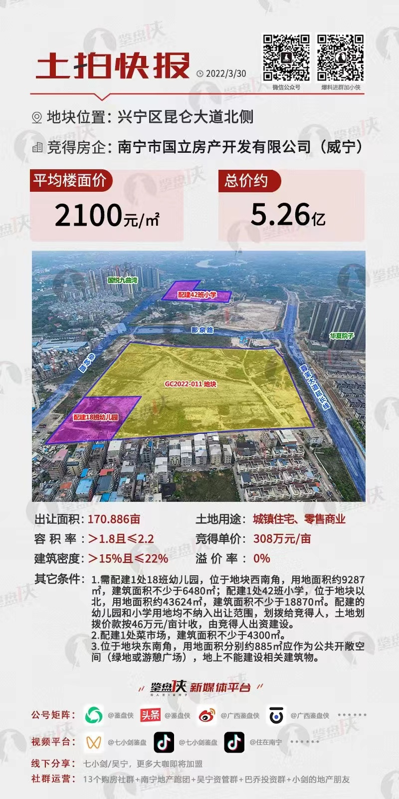 2022年3月30日,威寧房地產(chǎn)公司監(jiān)管單位國立公司以5.26億元成功斬獲南寧市興寧區(qū)昆侖大道北側(cè)地塊,成交單價308萬元/畝,樓面價2100元/㎡。