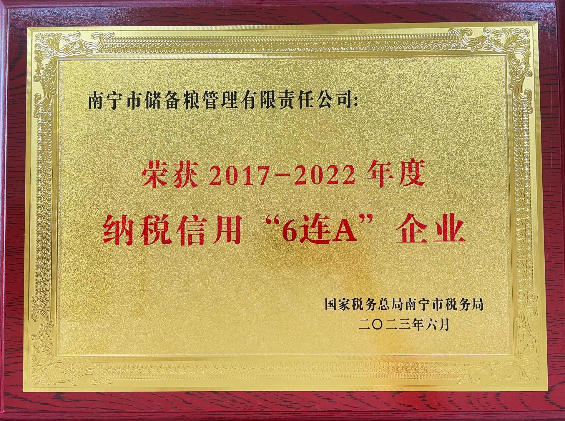 喜訊!儲(chǔ)備糧公司連續(xù)6年榮獲納稅信用“A級(jí)”企業(yè)稱號(hào)