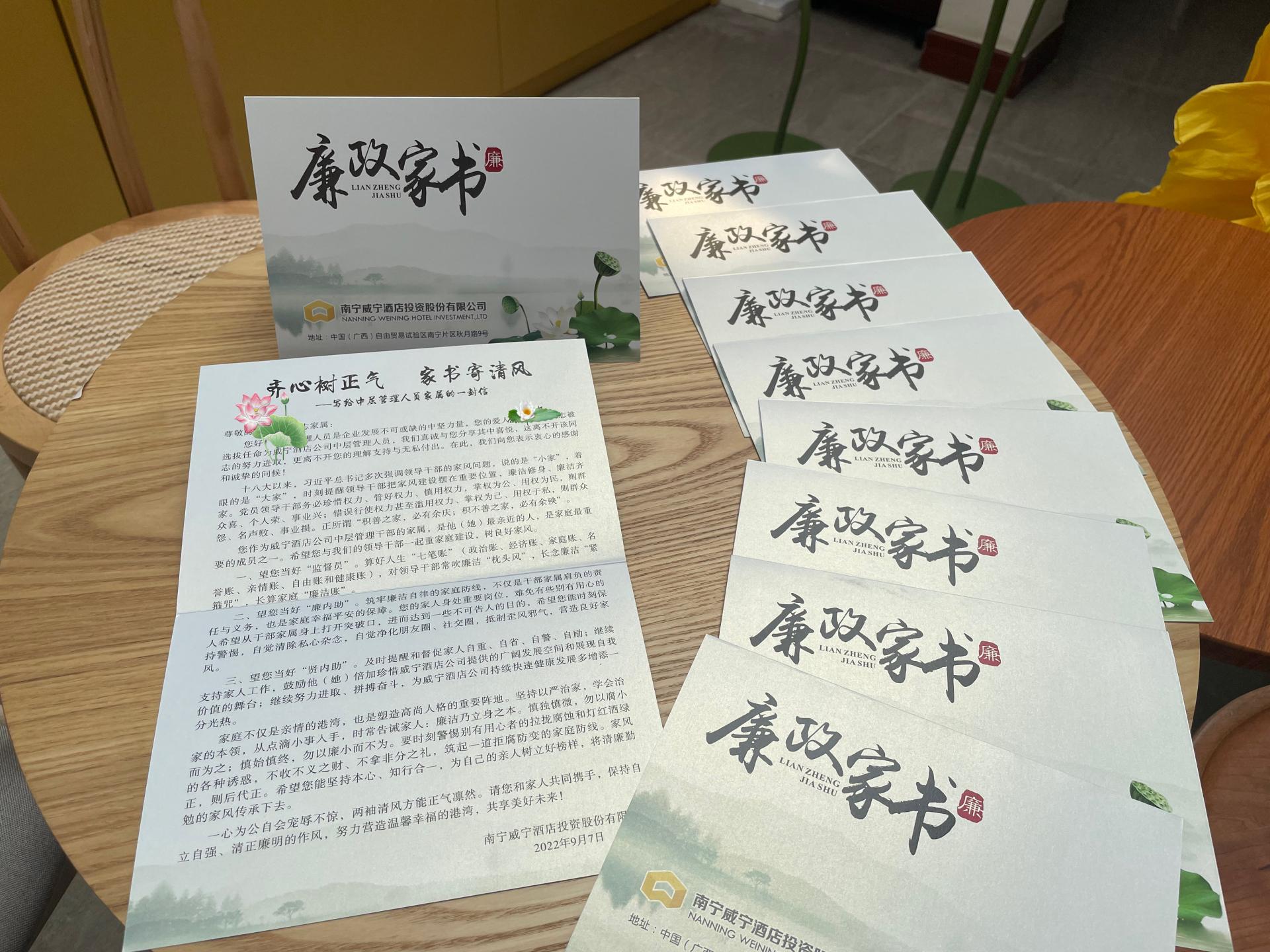 一紙家書寄廉潔,兩袖清風揚正氣。2022年國慶節(jié)將至,威寧酒店公司紀委開展“齊心樹正氣 家書寄清風”主題活動,由紀檢監(jiān)察室向公司中層管理人員及其家屬們寄家書、吹“廉”風,發(fā)揮家人在清廉建設(shè)中的獨特優(yōu)勢和積極作用?!澳鳛橥幘频旯局袑庸芾砀刹康募覍伲撬ㄋ┳钣H近的人,是家庭最重要的成員之一。希望您與我們一起重家庭建設(shè),樹良好家風……”這一封封以公司紀委名義寄出的清廉家...